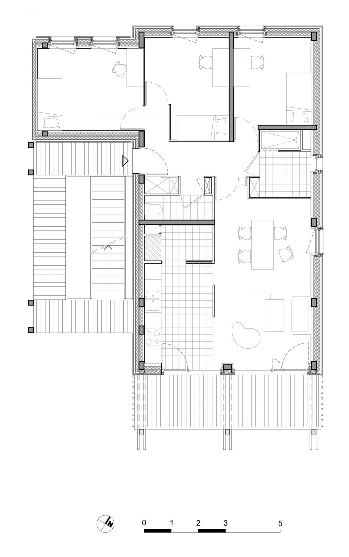 使用具有成本效益的木制建筑方法是一个优先事项。结构、木柱、混凝土楼板和木质外墙框架以经济的方式满足规范要求,同时取消了房屋内部的中间支撑部件,以保证空间的灵活性。这种简单的解决方案是通过计划的合理性和类型的严格叠加而实现的。