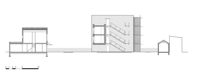 中间房屋的零散体量在停车场和中央小巷之间创造了一个过滤器。空隙有助于创造通过人行天桥和外部楼梯延长的序列,为城市提供显著的框架。