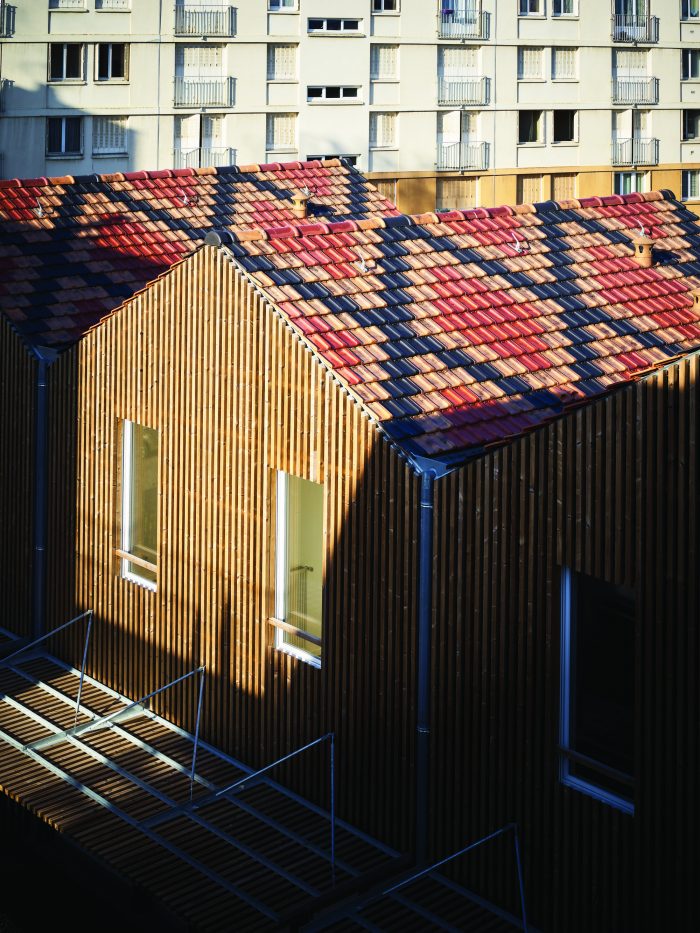 Particular attention has been paid to the fifth façade. The tiled roofs of the houses create a colorful landscape to overlooking housing. Contrasting voluntarily with the monotone facades of the surrounding dwellings, it recalls the characteristic pattern of historic buildings in Burgundy.