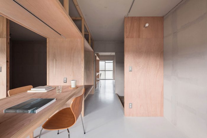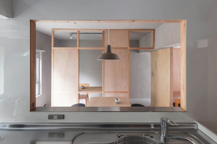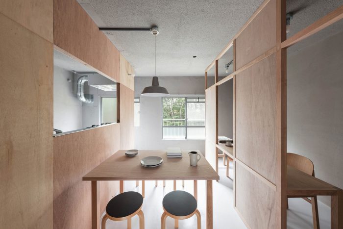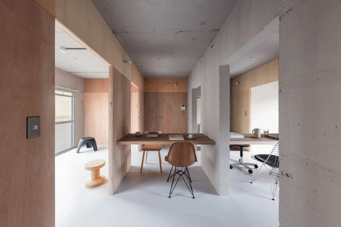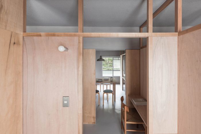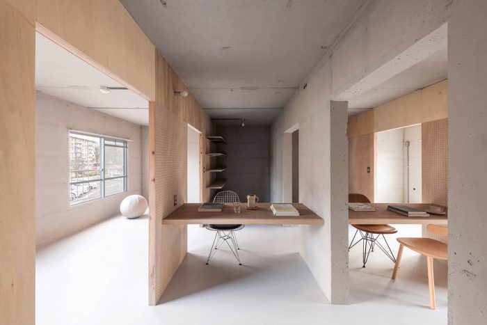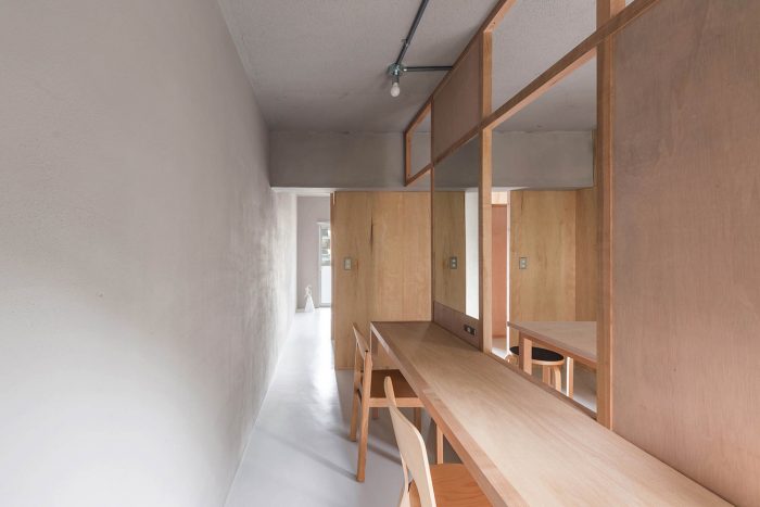 In plans A and B, the existing structural wall with its two openings is left in the center, and the position of the newly inserted wall and the frame is determined in accordance with the opening of the old frame. By reinterpreting the existing, we were able to realize a characteristic spatial composition that allows natural light and air to pass through.