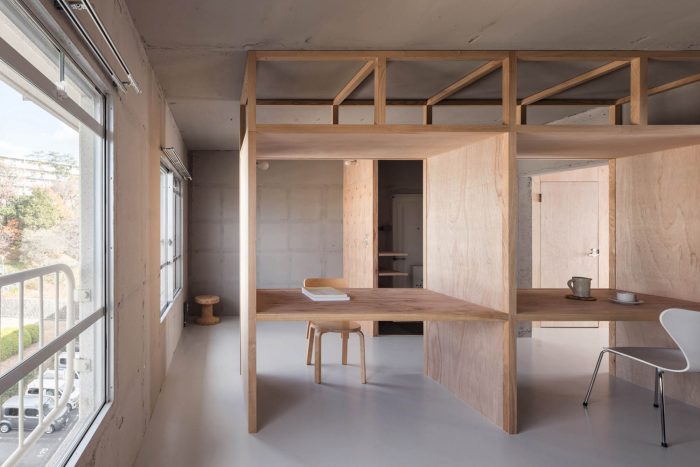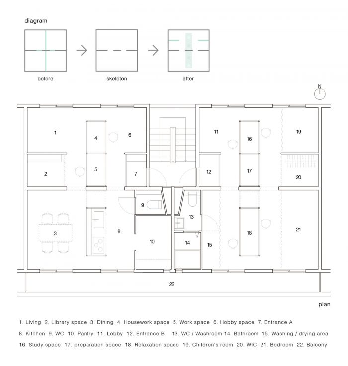Plan C - This unit is a single open space that allows for easy circulation with four intersecting walls with openings. The 45㎡ unit is divided into nine smaller parts in order to create a variety of different spaces. The free use of the space is encouraged by mixing areas for hobbies, socializing, reunion, and relaxation.