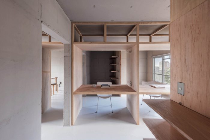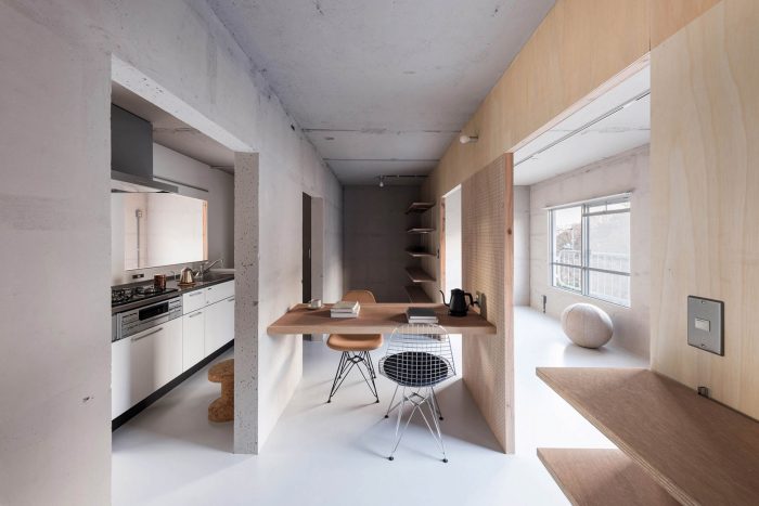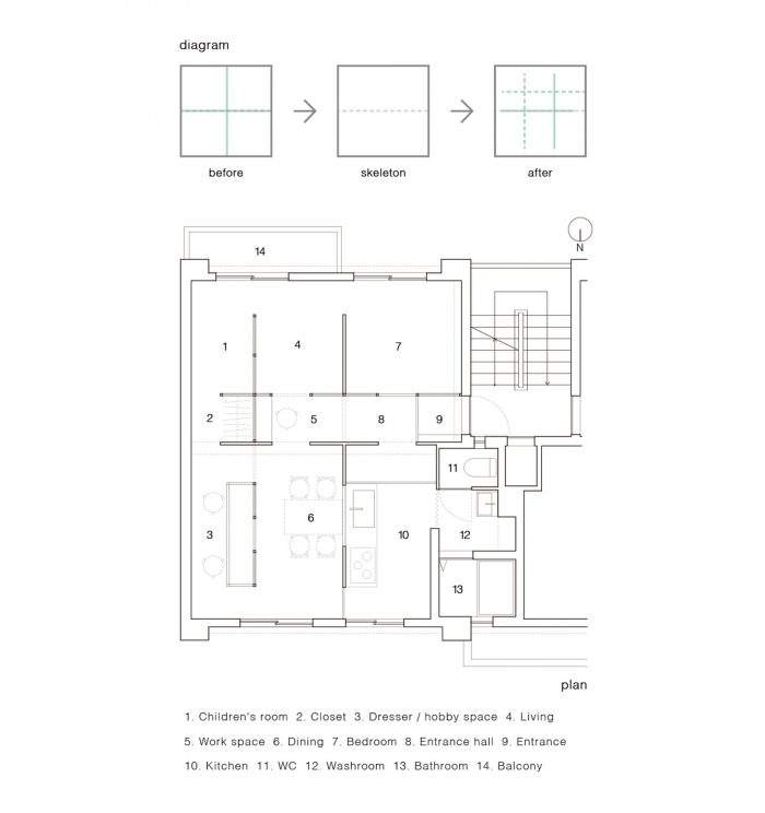 It was assumed that the concrete frame of the central structural wall and beams would remain. Through the process of renovation, we thought that it would be meaningful to utilize the existing structure without opposing its inherent spatiality. This project proposes a new way of living by considering the reinterpretation of the existing structure, and its relationship to the illuminated spaces that are unique to the housing complex.