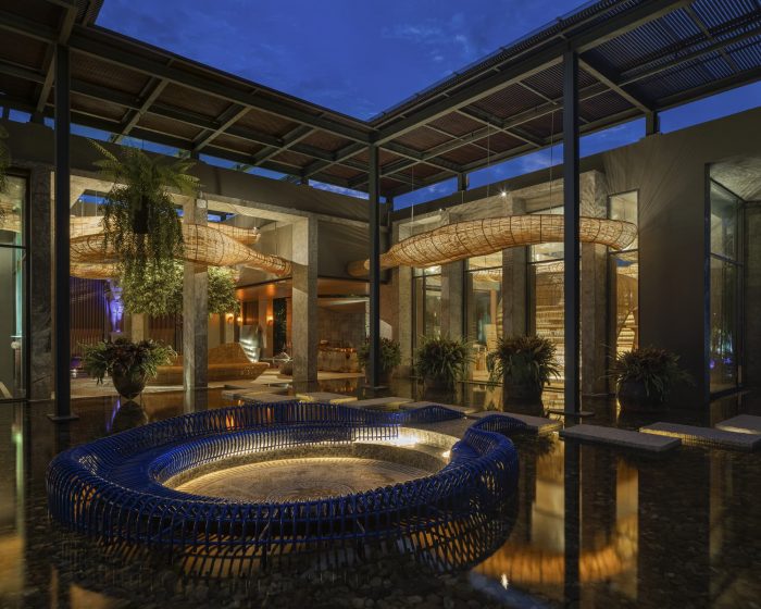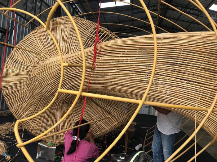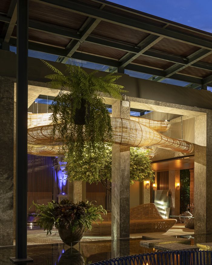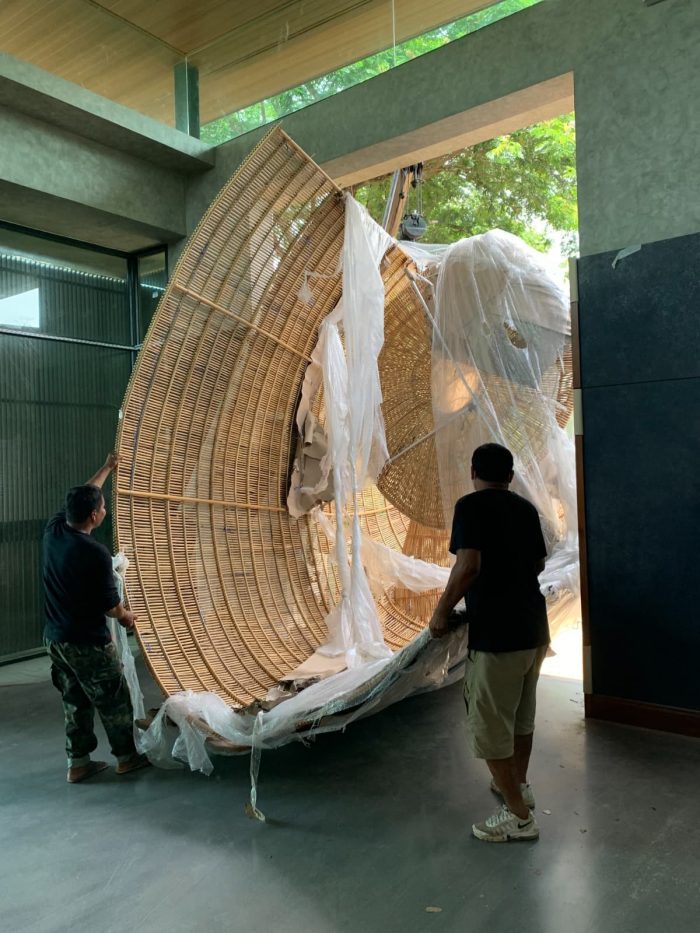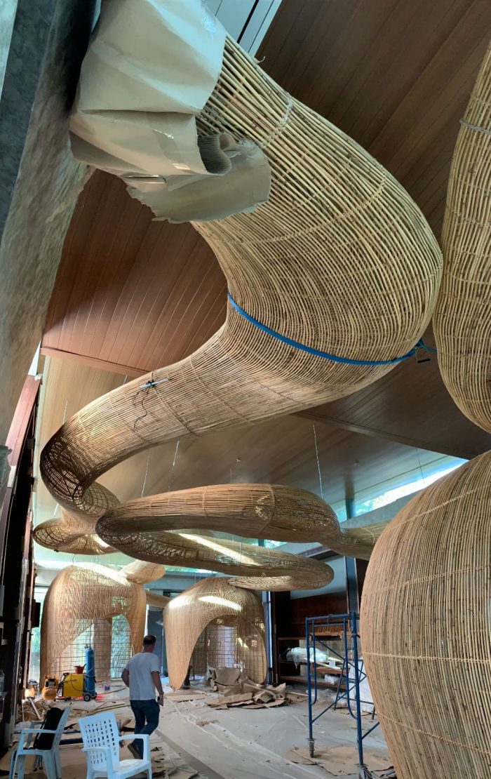 The concept centers on contemporary design ideologies of fluid space, parametric work techniques, and dynamic forms that cannot be viewed from a single vantage point. Using specialist software to simulate the movement of clouds and steam, the rattan structures thus weave their way seamlessly through the various zones, exterior and interior, culminating in a series of pod structures that serve as armatures for the forthcoming collection. Rattan works commenced during the lockdown period with the fabrication of the three main pods, spanning 5m, 4m & 3.5m high respectively. Each batch of work was then transported from the factory to the site in Chiang Mai and assembled on-site. The rattan lighting structure was the final installment, providing integration between interior and exterior as it floats harmoniously above the different zones, connecting the courtyard to dining and through to the display areas.