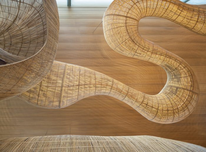 在这个项目中,可以描述一种流动的状态:无尽的变化和转变,一个持续的运动通道,由自然和藤条构成中体现的自然形式引导。反过来说,可以说大自然提供了像藤这样的天然材料的多功能性,在东南亚各地大量种植。"如果我们适应我们的环境,在建筑方面做到可持续发展并不难。当我们唾手可得地拥有所有我们需要的高贵材料时,我们为什么要使用合成的、有毒的塑料呢?"基恩问道。