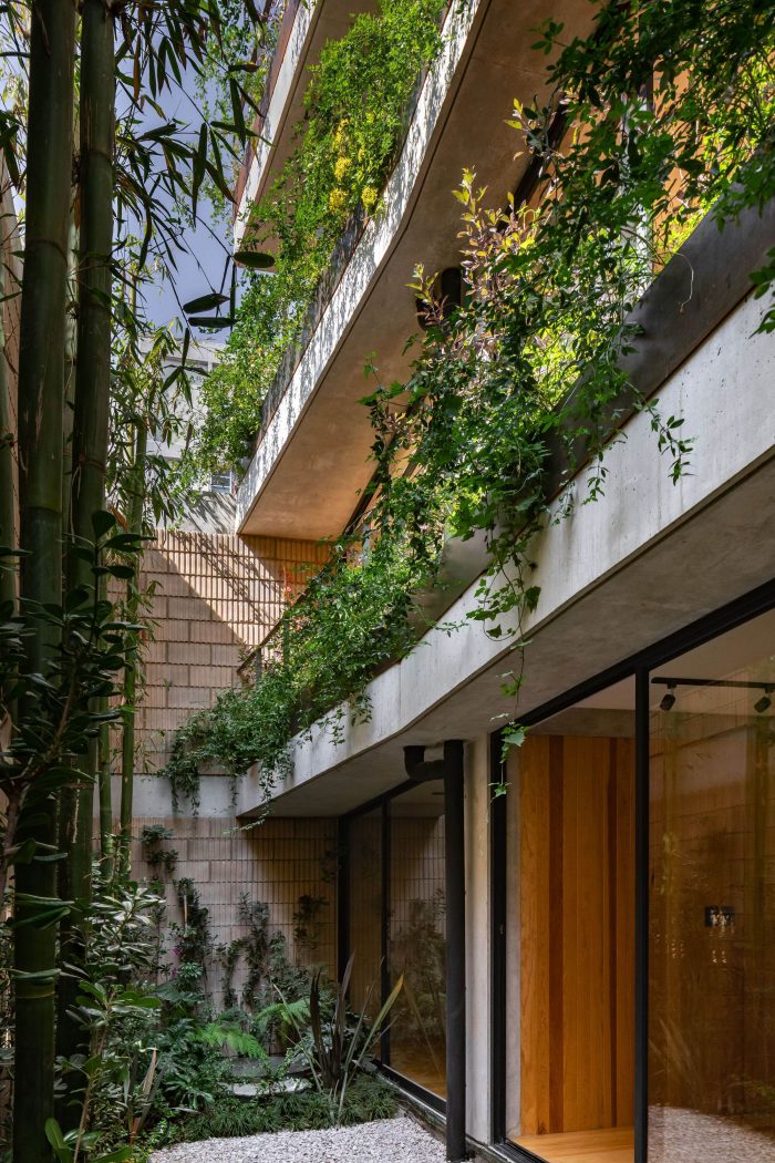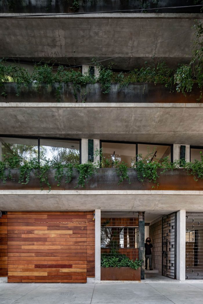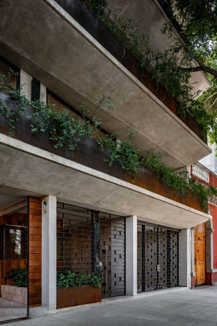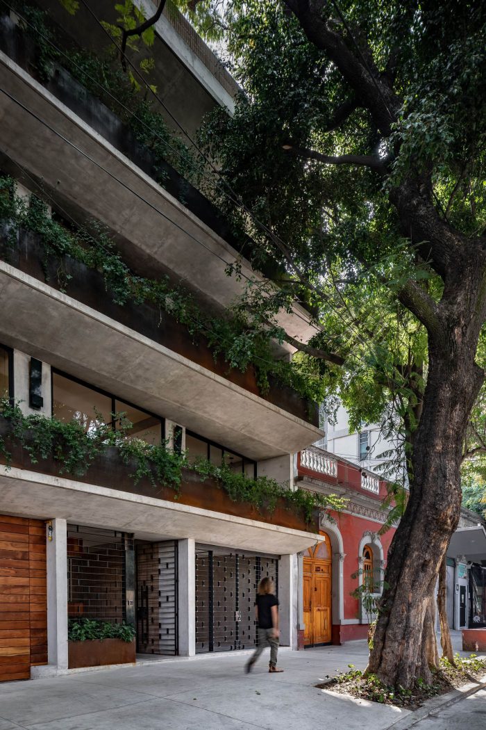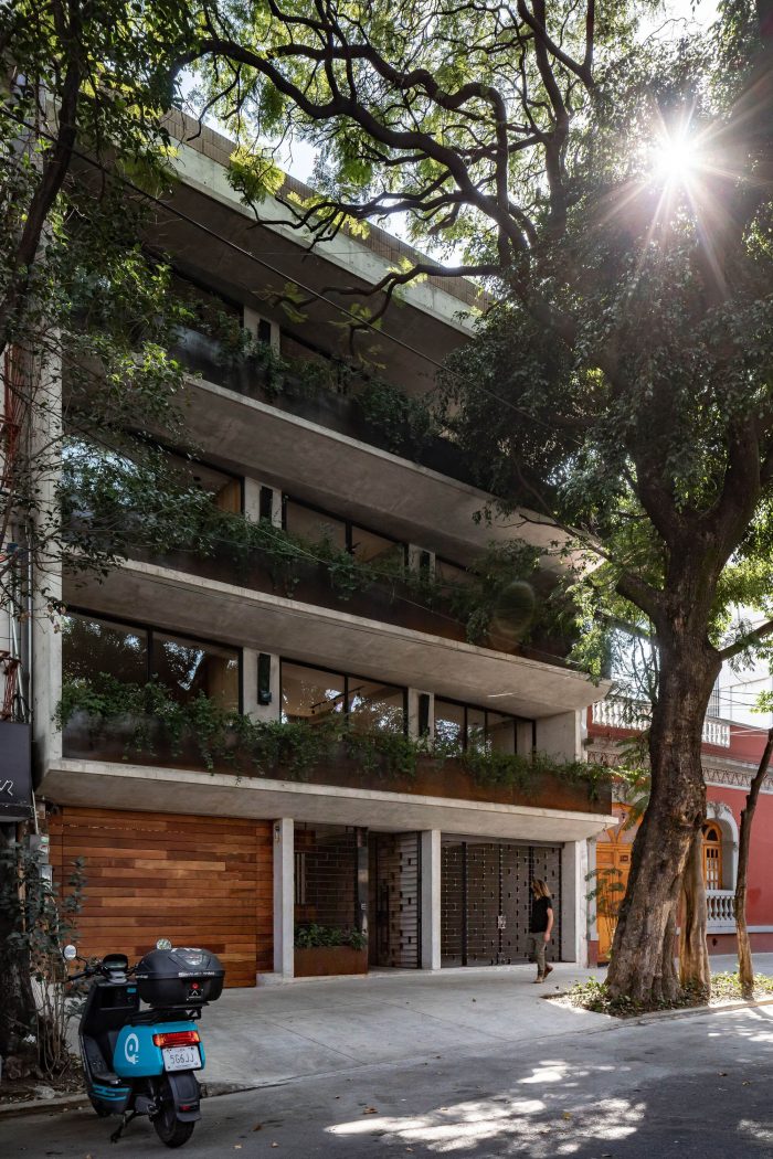 In the Roma district of Mexico City, four residential apartments rise up next to an ancient jacaranda tree. Steel planters run along with a series of balconies that disappear between sturdy branches of purple flowers and hanging jasmine.