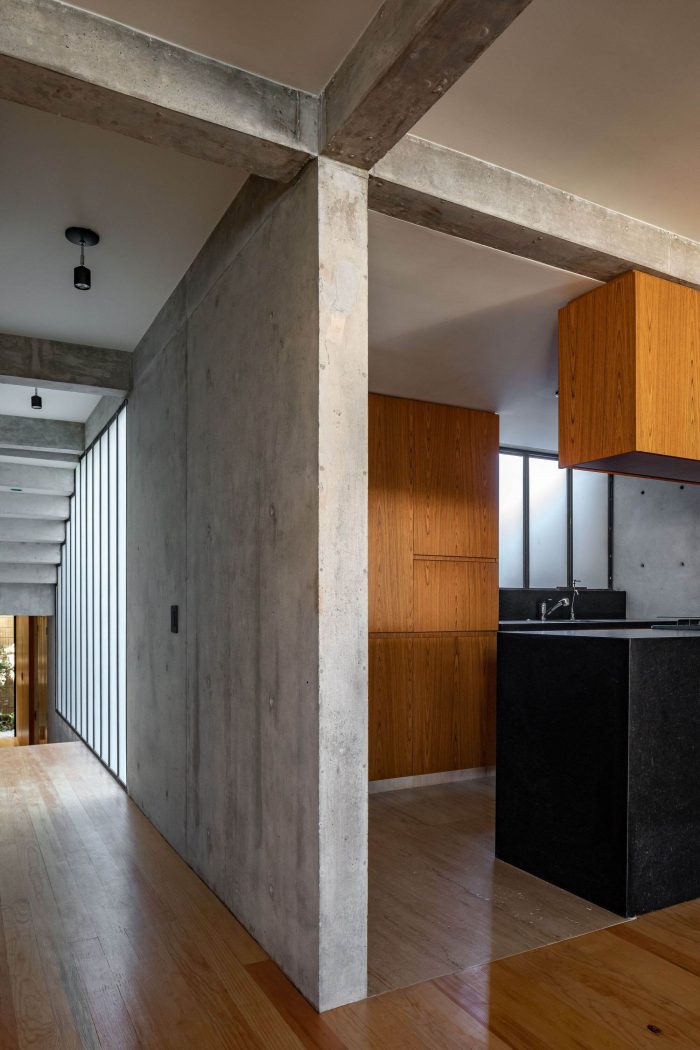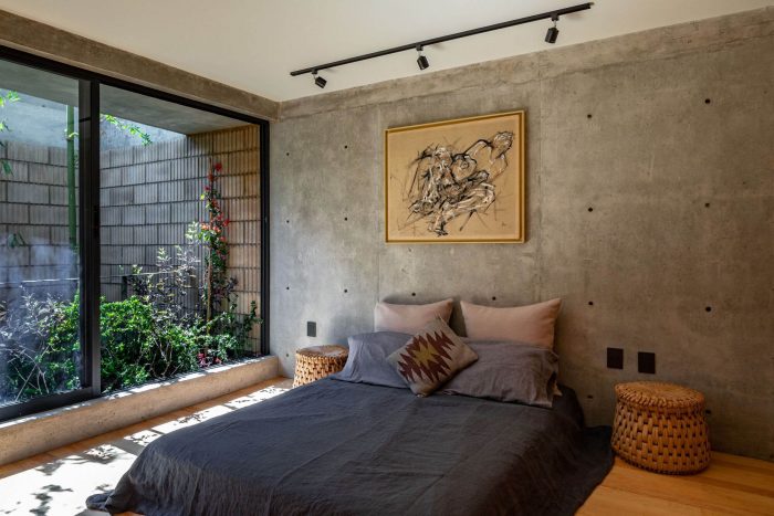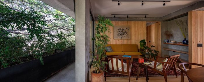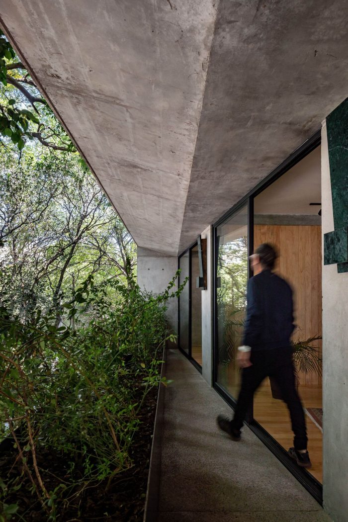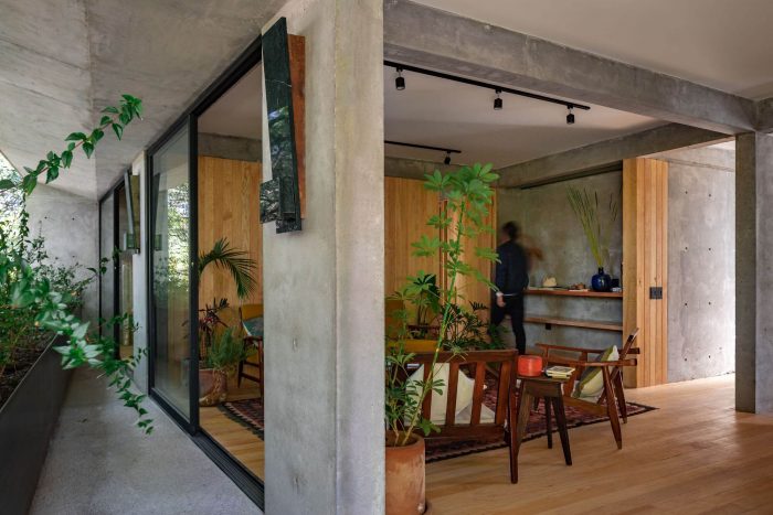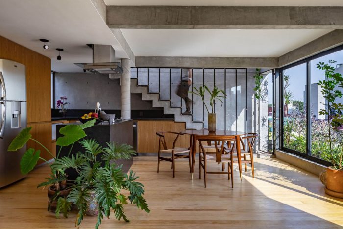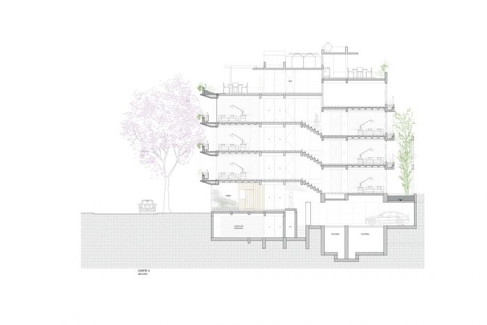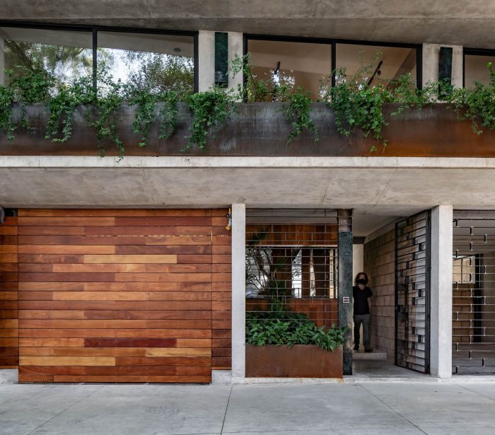 In the Roma district of Mexico City, four residential apartments rise up next to an ancient jacaranda tree. Steel planters run along with a series of balconies that disappear between sturdy branches of purple flowers and hanging jasmine.