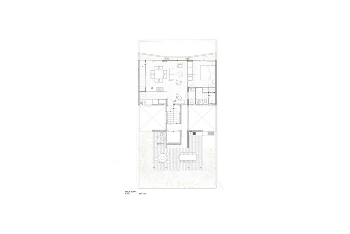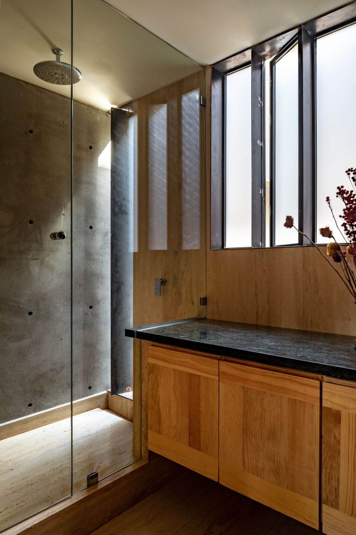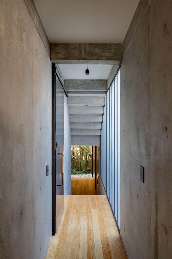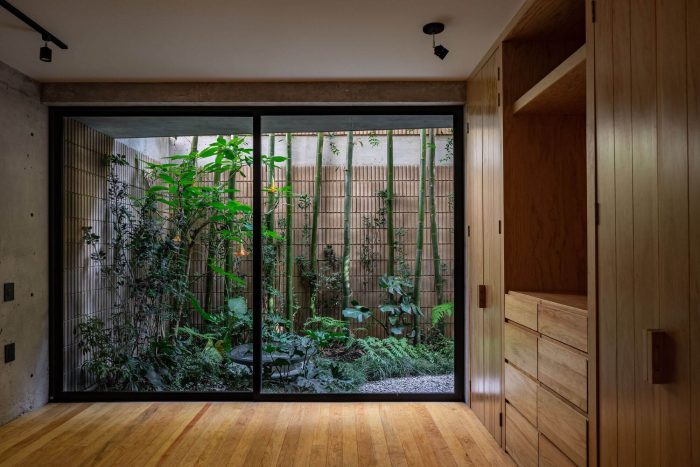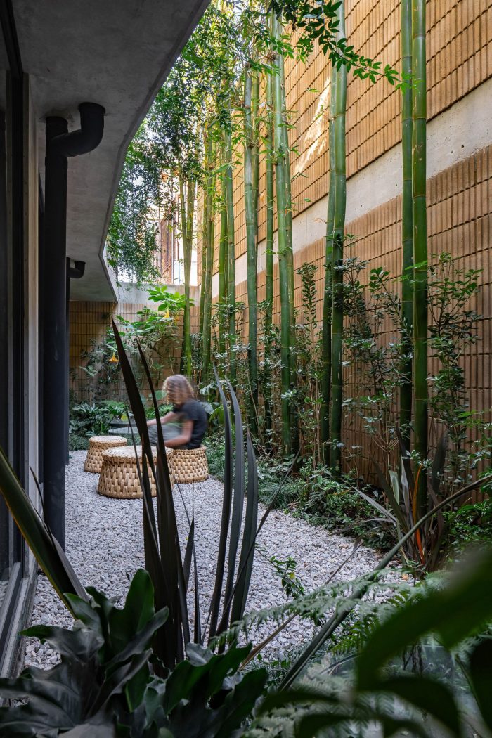 To the south, a curtain of bamboo sweeps across the width of the back garden protecting views from outside gazes and filtering the intense light through its translucent leaves that emulate the sound of rain when the wind circles through them.