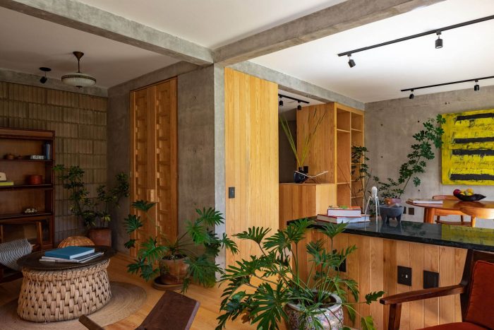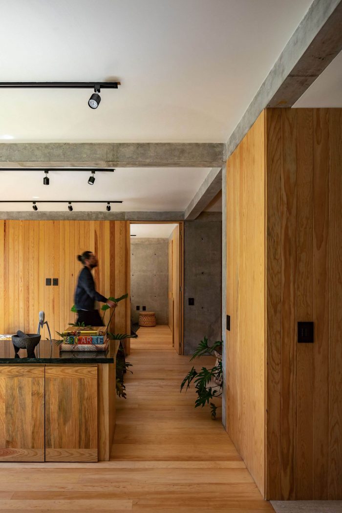 Wooden floor-to-ceiling shelving and paneled walls create privacy for the more intimate areas of the apartment whilst still maintaining an open planned layout in the communal area where the kitchen, dining room, and living room coexist without obstructions.