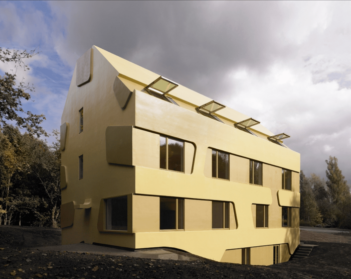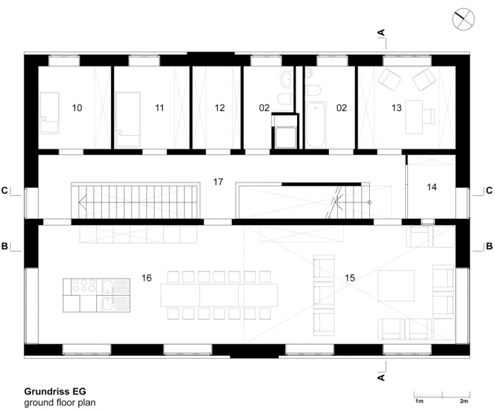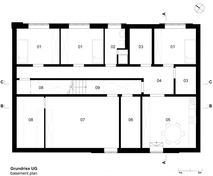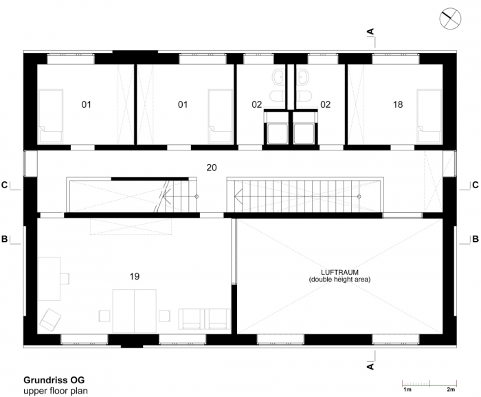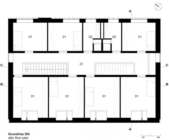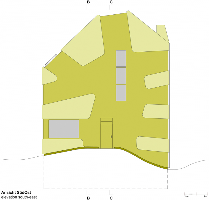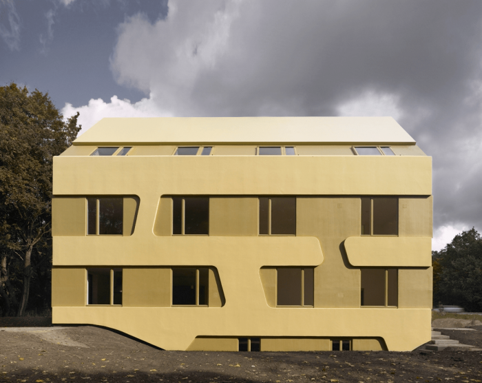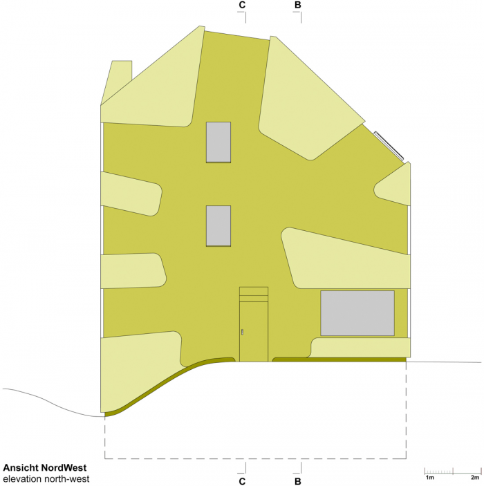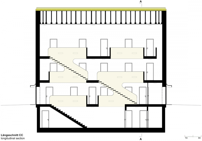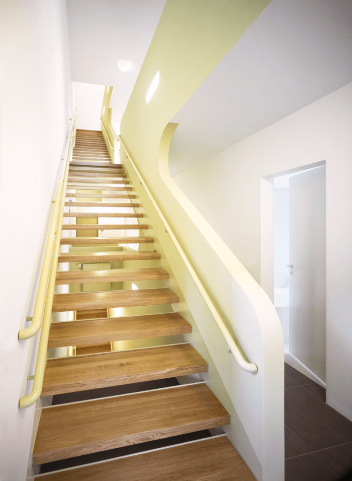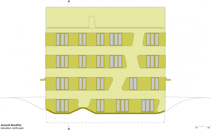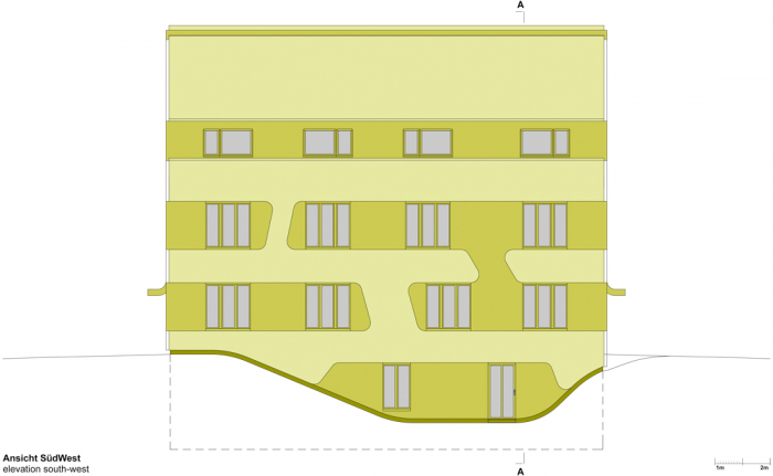 该建筑的特点是基于双色浮雕立面,包容了紧凑的房屋体积。一个中央楼梯穿透了楼层之间的划分,有利于交流,为社区创造一个中央开放空间。