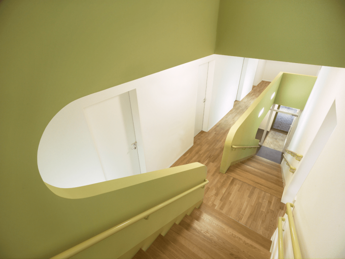 The characteristics of the building are based on a two colour relief facade embracing a compact house volume. A central staircase penetrates the division between floors in favour of communication to create a central open space for the community.