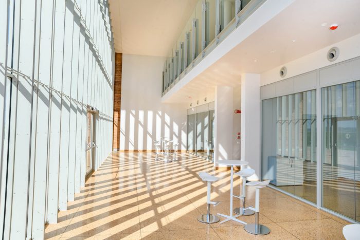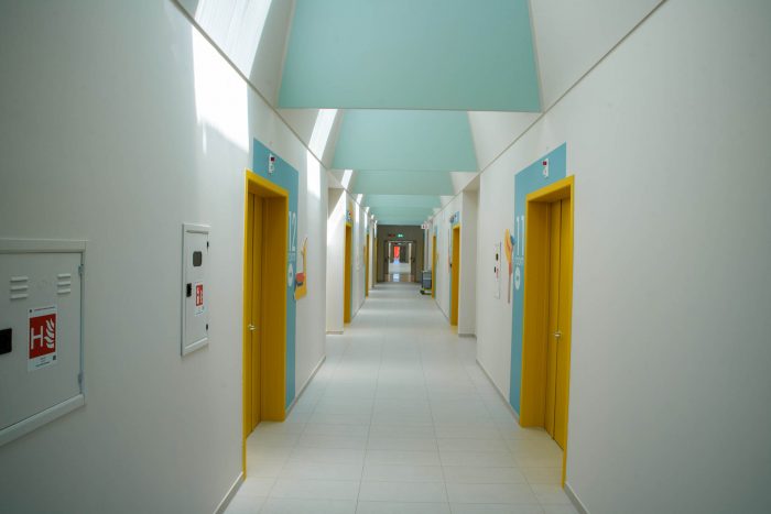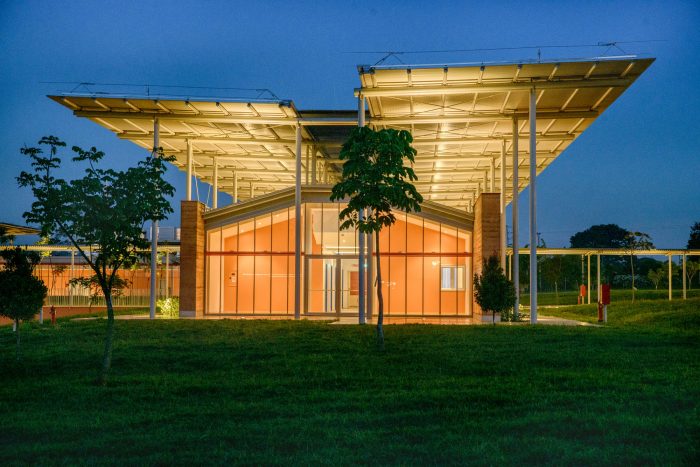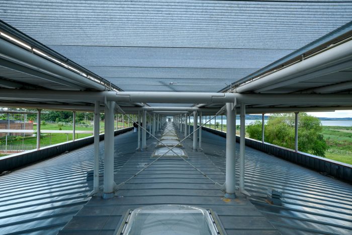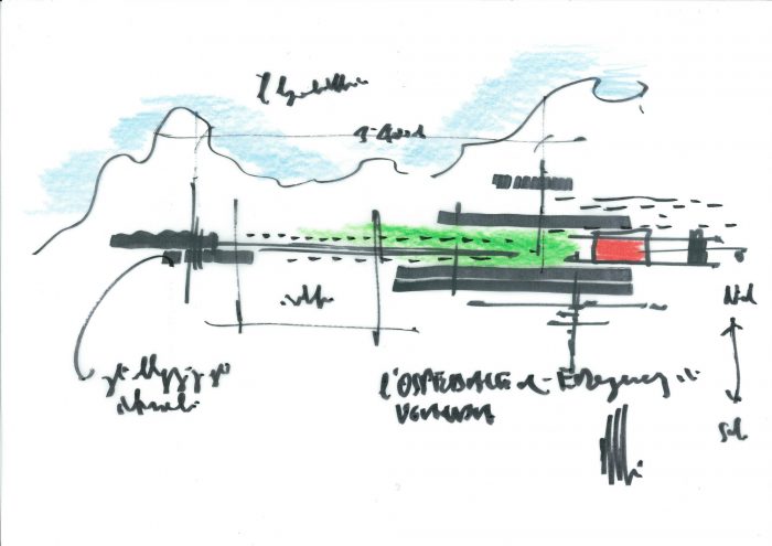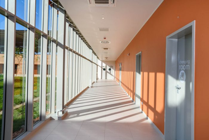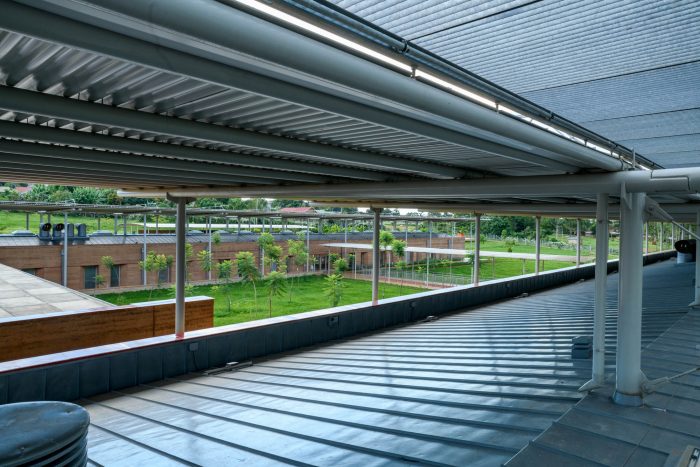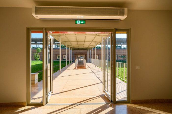 This building, born from the earth, will get its energy from the sun. Indeed, the roof is made from a suspended canopy structure supporting 3,600 square meters of photovoltaic panels. This system will ensure that the hospital has an autonomous electricity supply during the day. The photovoltaic roof, “floating” above the building, will also guarantee shade for the hospital and all the uncovered walkways.