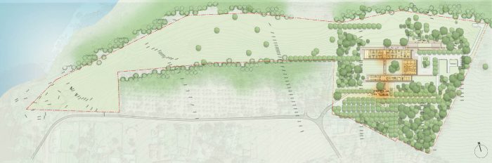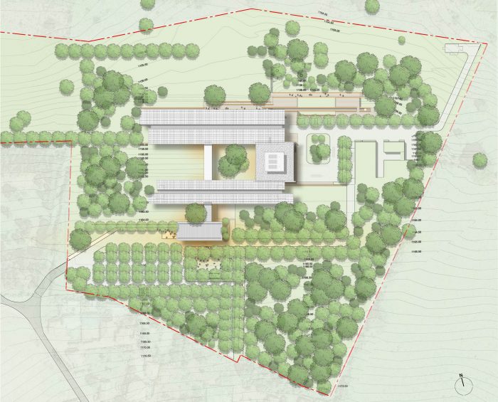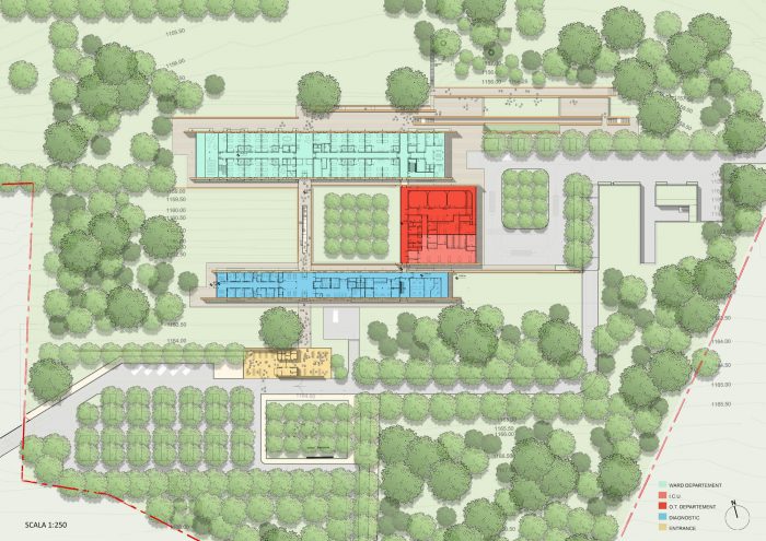 The building will follow the curves that slope down to the lake. By following the course of the land, the hospital walls and the boundaries of its outdoor pathways will form terraces on which the hospital itself will stand, in a spatial continuum between interior and exterior, above and below. The stacked walls will break the distinction between the various zones, creating a unity between the lake, the park, and the internal hospital environment.