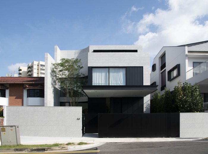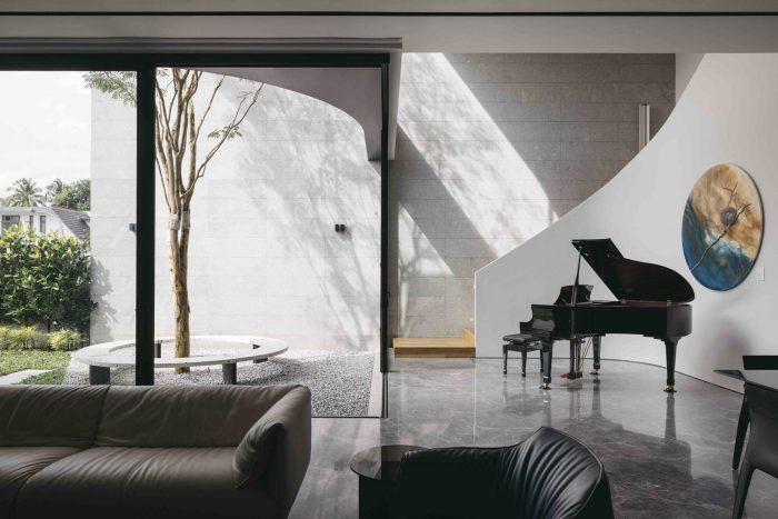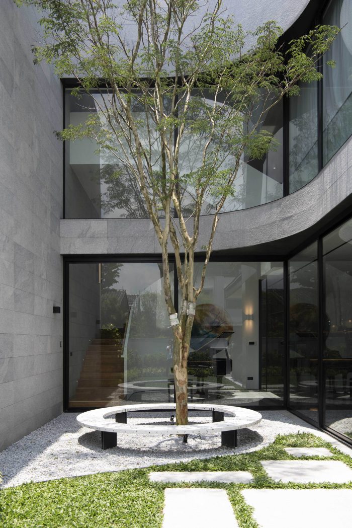 A curved external courtyard defines the character of this family home in Singapore. Due to the highly built-up nature of suburban districts, the courtyard was conceptualised as a means to create inward facing views, and introduce light and ventilation into the house without sacrificing privacy.