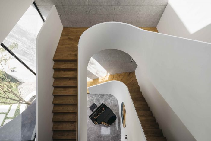Chord House, termed due to the notion of how two points on a curve are related, inverts this idea, and we employed a curved building form to emphasize the notion of the courtyard being carved out from the house, much like a negative vase-like space containing a piece of landscape or planting. This is reinforced by the contrast of the curved façade to the rest of the house, which is mainly straight and rectangular in form. This continues on to the design of the arching staircase inside the house, which is closely related to the courtyard and derives its shape from it.