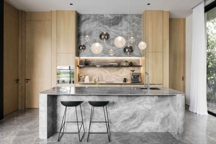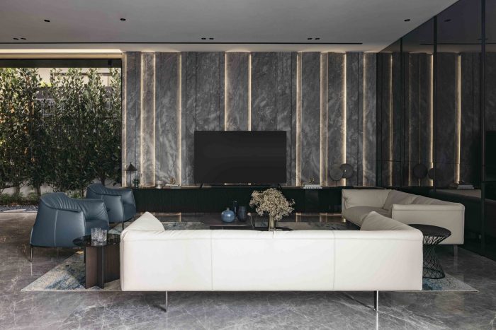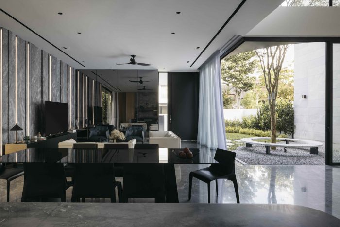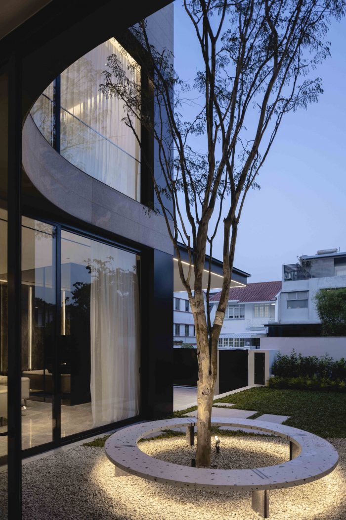 Light bush-hammered granite stone was selected to clad the building mass, with black aluminium frames as contrasting elements. It was intentional that the external stone cladded wall should continue on into the interior staircase atrium, so that the threshold between inside and outside should be seamless. For the courtyard, a single tree known locally as a 'leopard tree' was sourced and imported from Malaysia. A custom-made circular terrazzo bench was casted at its base. The sun casts shadows of the tree branches deep within the house, forming varying patterns on the staircase atrium wall depending on the time of day. On the interiors, grey marble flooring and a combination of dark and light oak wall panelling complete the material palette.