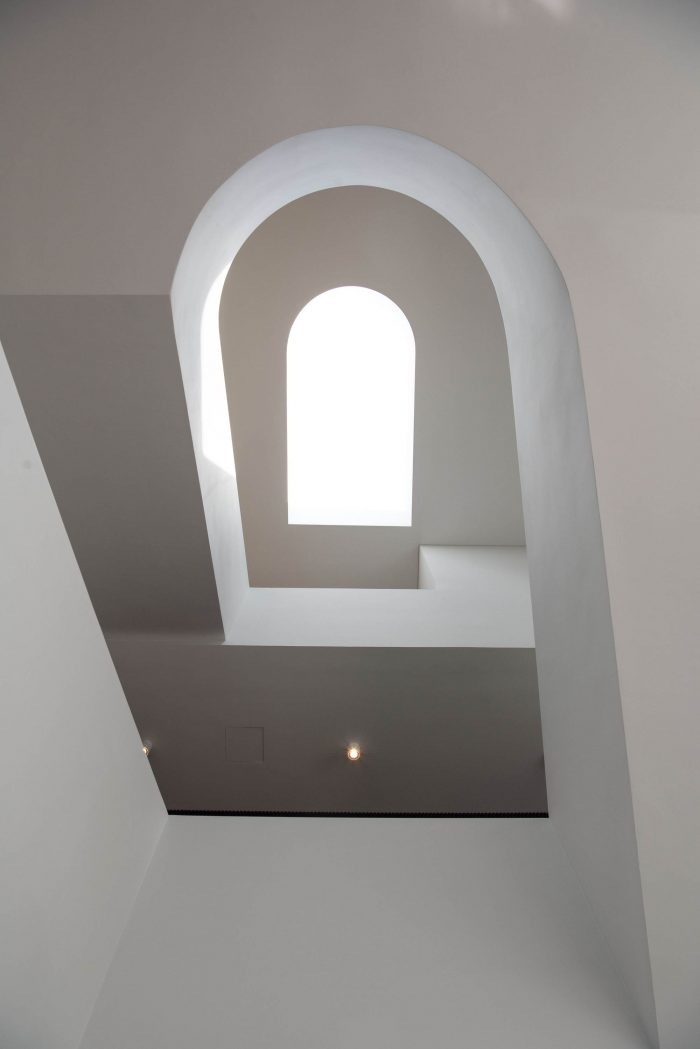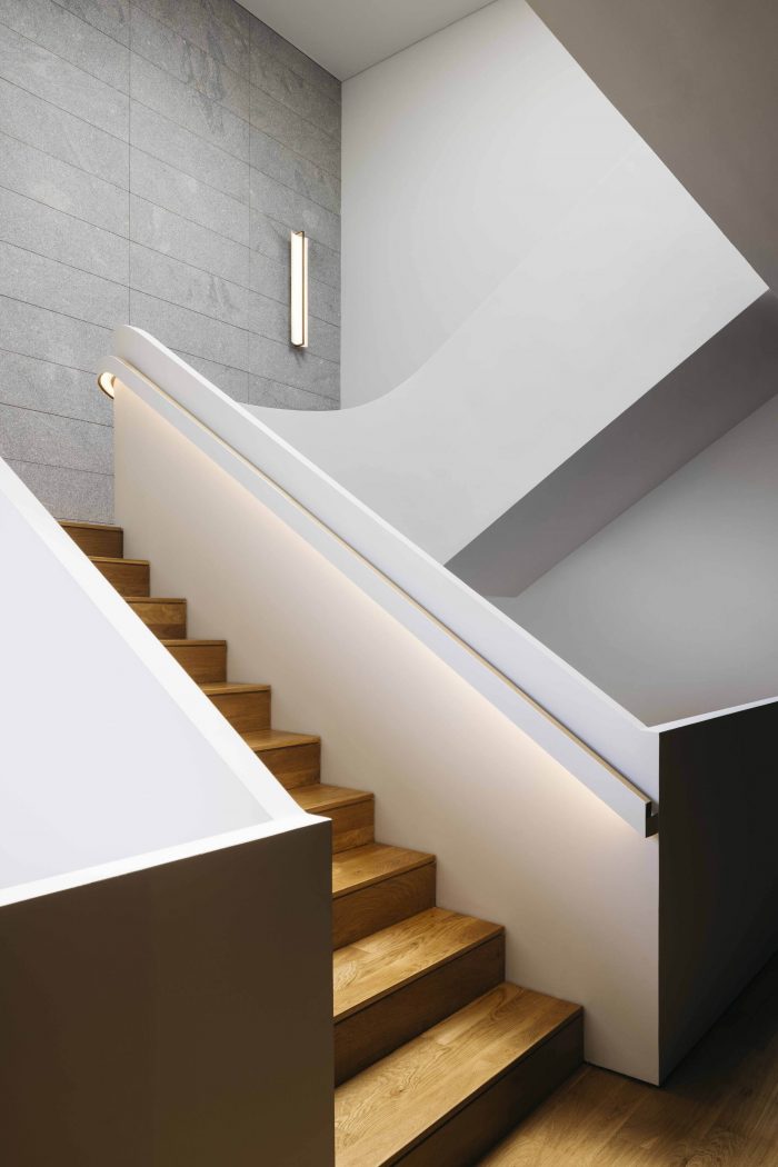 弦乐之家 "是由于曲线上的两点之间的关系而得名,它颠覆了这一概念,我们采用了一个弯曲的建筑形式来强调庭院从房屋中被雕刻出来的概念,就像一个消极的花瓶一样的空间,包含了一片景观或种植。弯曲的外墙与房屋的其他部分形成对比,加强了这一点,后者主要是直线和矩形的形式。这一点一直延续到房子内部的拱形楼梯的设计上,它与院子密切相关,并从院子中获得了它的形状。