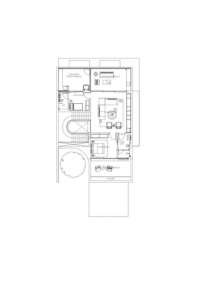 典型的新加坡住宅的门窗都是朝向周围的邻居和街道的。房子的形式是对这种城市环境的回应,向内看是院子,高高的围墙提供了与相邻邻居的隐私。这座房子的一个重点是邀请自然光和内部景观,庭院与主要生活空间和楼梯中庭相连。