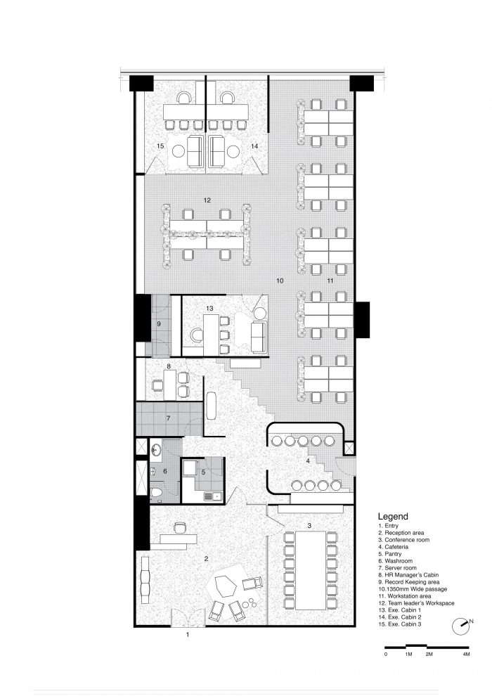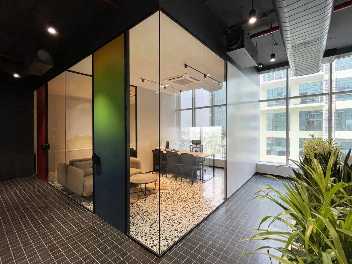 The 3 executive cabins were cordoned off in glass cabins to achieve the necessary private spaces while also maintaining the overall transparent nature with areas that are more free-flowing and spill over into each other. Upon entering the office, a vibrant Reception leads into the main Workspace via the service annex. This annex consists of washrooms, a pantry, the server room, and the cafeteria. Placing these adjacent to each other, separating only the cafeteria from the rest of the annex, across a passage, the user is provided with an opportunity to feel the expanse of the work area lying beyond, only after stepping into it from the narrow passage. This also enhances the principle of the “Axis” of the space. The choice of keeping the services and meeting room near the Entrance was for the ease of logistics.