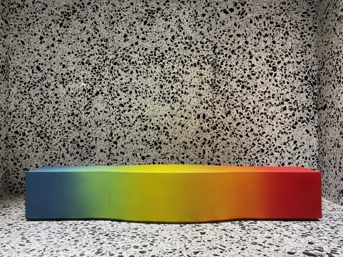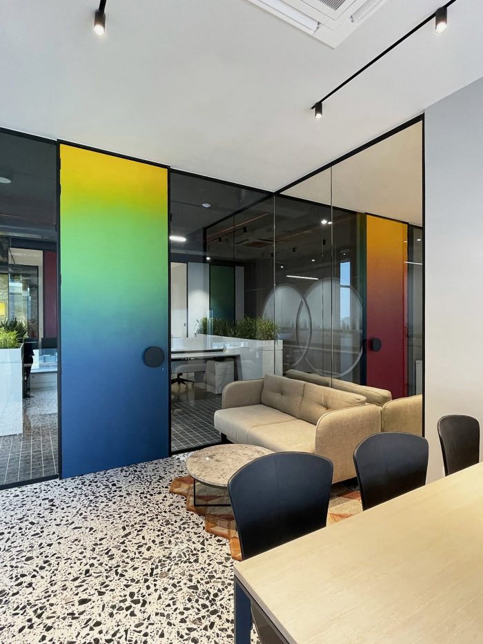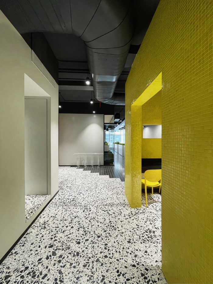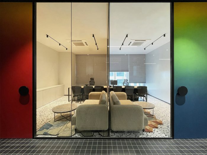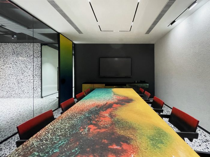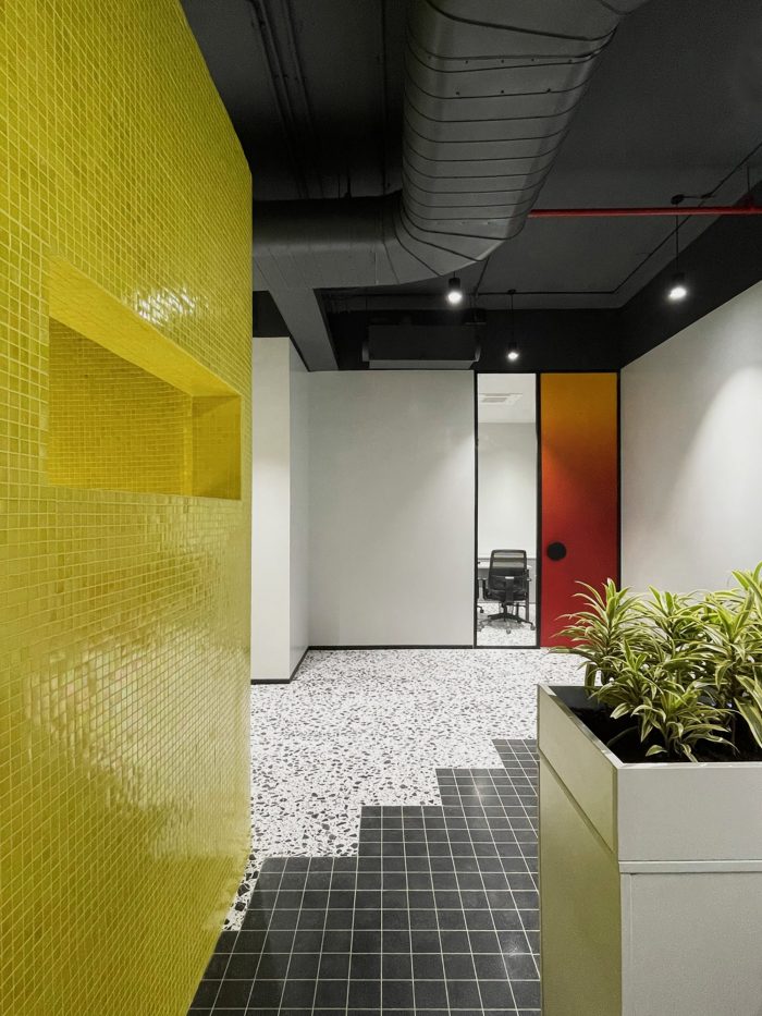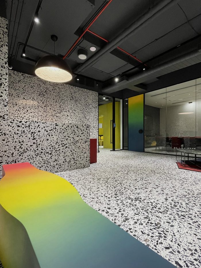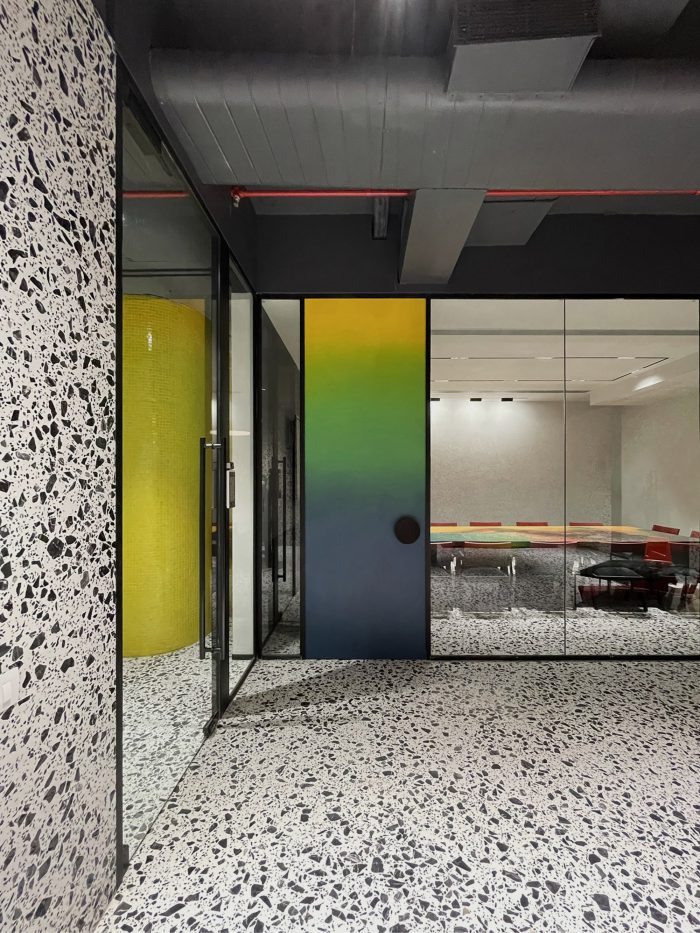 Whether it’s the solid partitions or ornamental furniture or dramatic accent pieces, “layers” have been created to fashion a stunning experience of “chromatic indulgence”. This is seen in the “crafted color” doors in rainbow hues; a cafeteria cladded in glass tiles to achieve a monolithic look; a sculptural bench, in the Reception, painted in a gradation of colors; the Conference table top and console, whose fascia are treated with graphically exploded paintings, with synchronized shaded chairs – all of which are sitting on a monochromatic backdrop of white terrazzo and locally available black “Kadappa” stone, generating a remarkable visual as well as a spatial experience. Exposed services were another practical yet creative intervention of doing away with conventional flat false ceilings and allowing the room more volume.