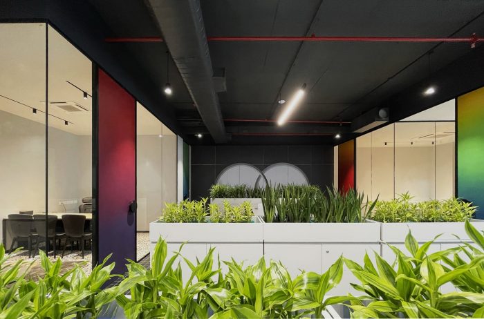A number of challenges governed our design process: the site was linear, with light coming in from the opposite end of the entrance through the only window in the entire space. Nevertheless, maximum natural light was to infiltrate both, the workspace as well as the cabins. This was achieved by a primarily open floor plan with workstations interspersed with planter boxes that double as storage cabinets – an efficient furniture design to integrate landscape in an otherwise tight space. Secondly, since the primary users were young employees, a “quirky” space was to be envisioned, while not losing the integrity of a corporate office.