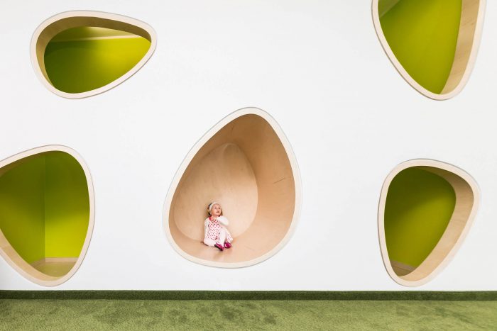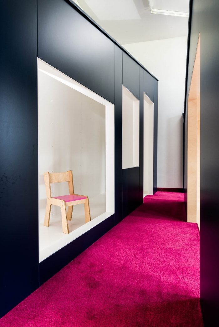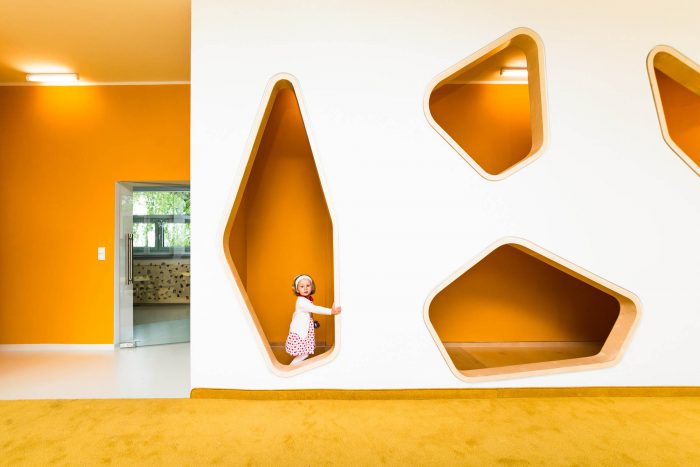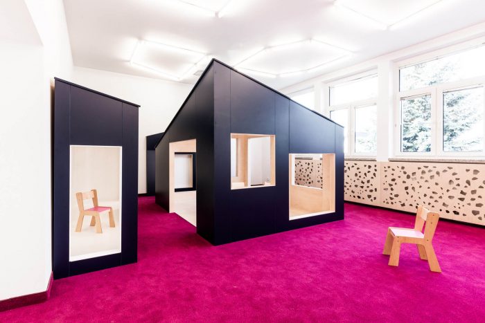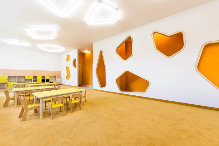 In our project we respect stages of children’s interests, develop within the age. We distribute function and materials around the building in logical, natural order. Varity of open and cozy space is a simply invitation for insane fun at one time, as well as calm rest later on. Pin up- and chalk- boards helps kids to express themselves, while being inspired by everyday life objects turns into fairytales environment. For instant there is transformation of ordinary elements into world of imagination: wall into lively meadow with animals, hangers into colorful flowers on children’s height, access into magical tunnel and celling become game of shapes. Kindergarten plays to the role of a guide, gently helping pupils to understand surrounding.