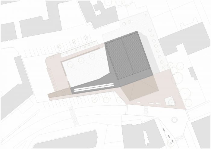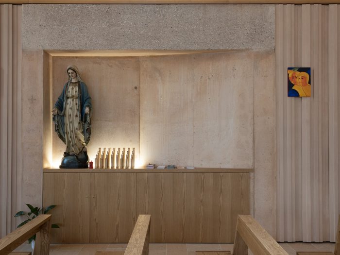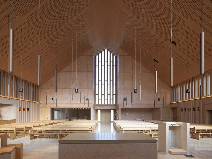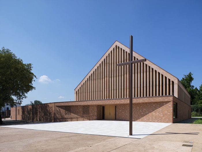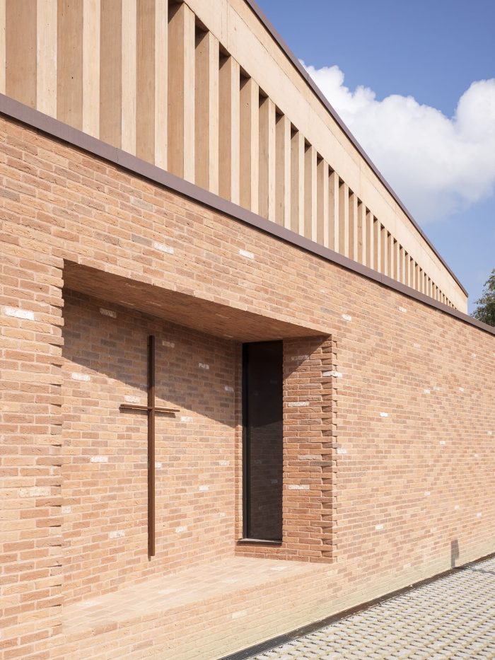 The main facade extends on one side into a low building with a flat roof. This basement volume encloses the parish hall and other rooms for parish activities. It is clad in brick in varying tones from red to cocciopesto. Concrete acoustic panels with vertical grooves line the basement level inside.