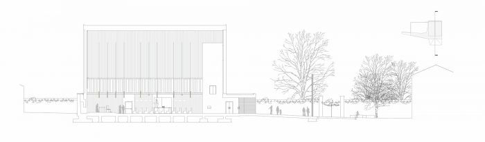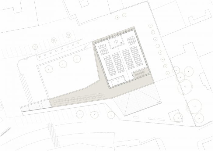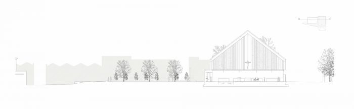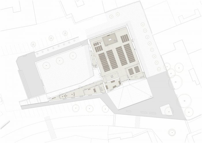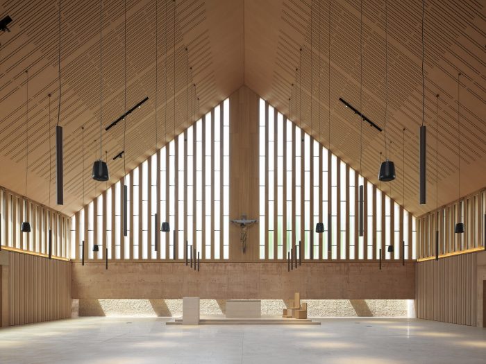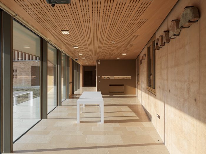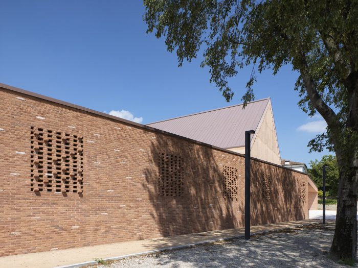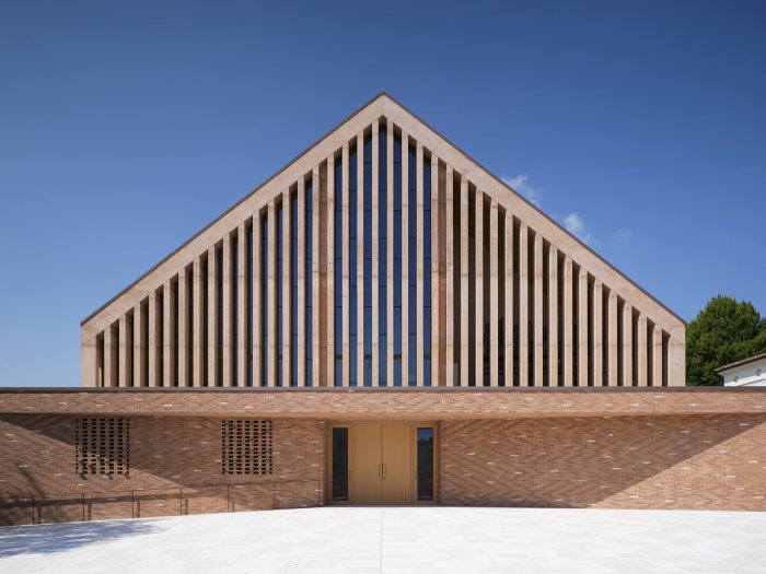 The new building occupies the lot through a wall from which the gabled volume of the hall emerges. The parish hall is a free central space. Dense, slender terracotta-colored concrete pillars and full-height windows run on the perimeter. Two rows of suspended tubular light fixtures mark the inner space.