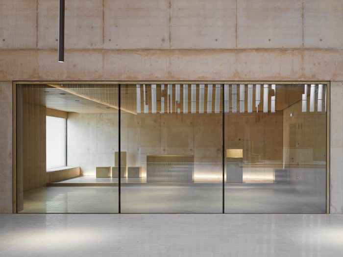 On the back of the chancel stands the mosaic "Earth" as a symbol of "rebirth-resurrection." It is set back from the upper pillars and lit by a hidden skylight. The used materials are brick fragments from the demolished church and gold tiles. They are assembled on a sloping wall using the opus scutulatum technique. Ground excavations uncovered a complex stratigraphy of ancient worship structures. Three portions are visible through slots cut into the floor. They will be opened on special occasions, showing the direct dialogue between the present and past.
