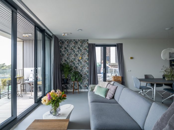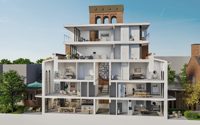 After some sketches in which the architect proposed to alter the building very much, they came up with a design that left the character of the church intact. The architects decided that the current church should also be leading in the design of the apartments. This led to minimal interventions on the outside except for two added layers on top of the roof. New windows we added sparsely with frames hidden behind the wall and they kept the main entrance with the oakwood doors. The defining elements of a church, the tower, the altar, and the nave were all kept as much as possible untouched.