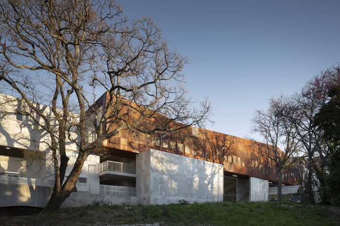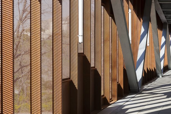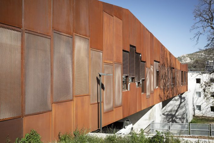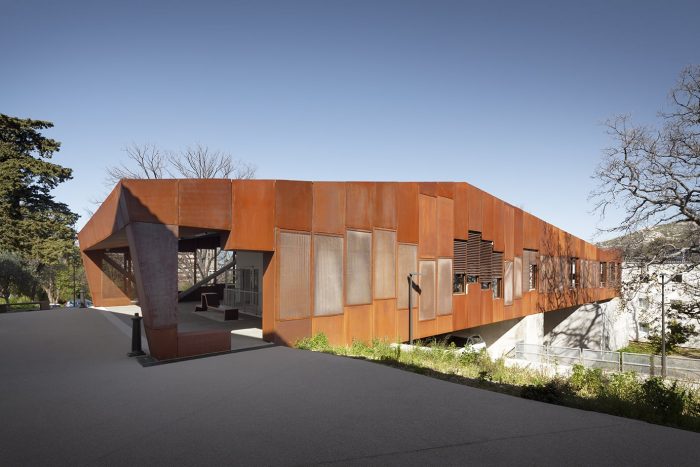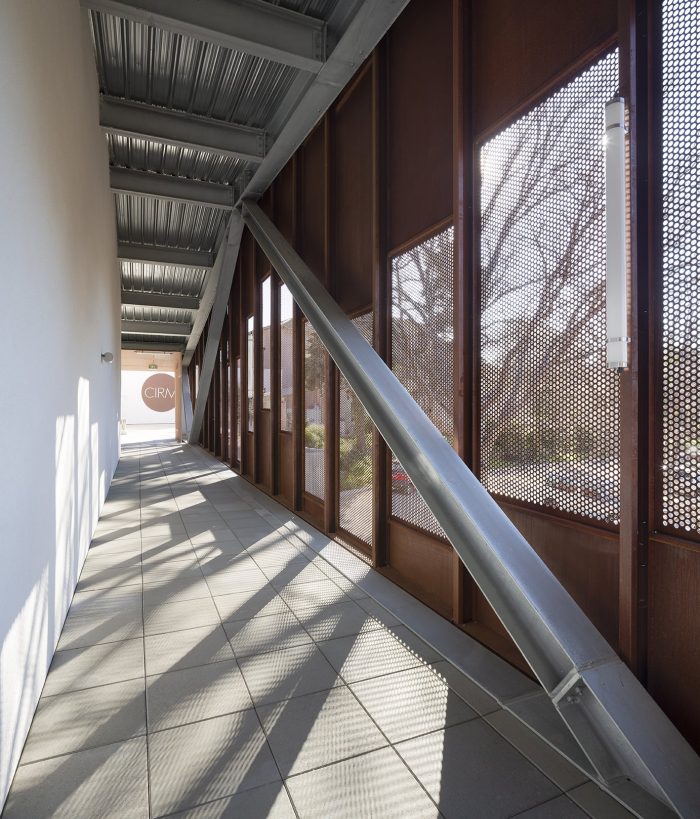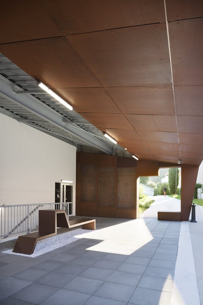 The walkway was designed in metal. The choice was made to use a WARREN beam structure that is entirely visible, thus contributing to the reading of the work. The facades are made of perforated corten plates, taking on the role of ventilation and visual permeability of the moucharaby traditionally present around the Mediterranean.