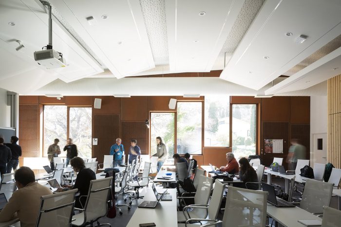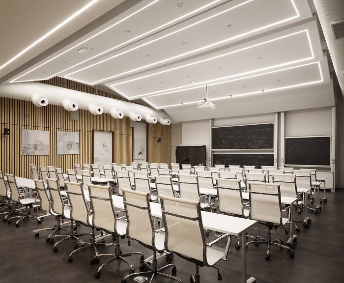 Therefore, we thought of this bridge-building as a large exterior corridor serving both covered terraces and interior spaces: the workroom, the offices, and the conference room, which is one of the key spaces of this project because it is really the place where the results of the researchers' work are presented.