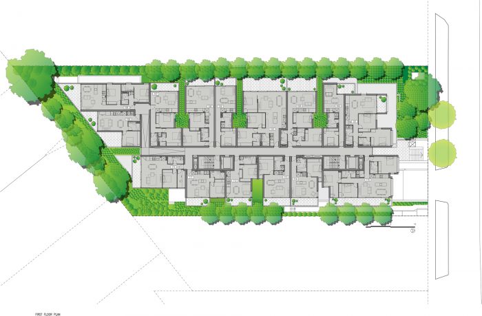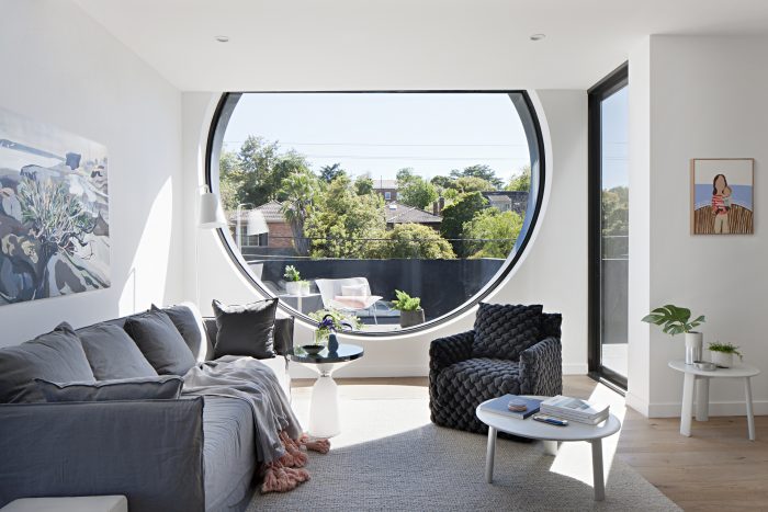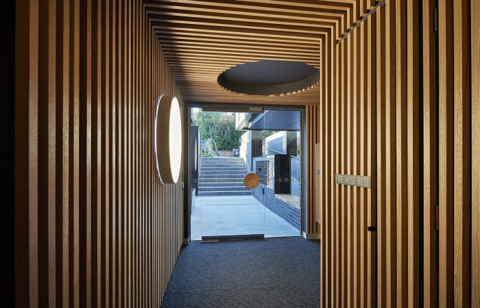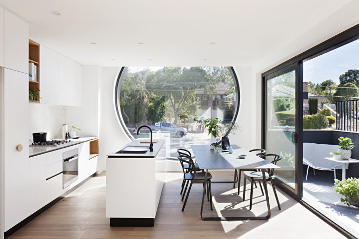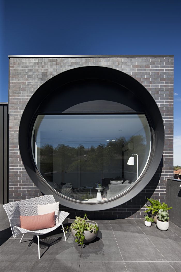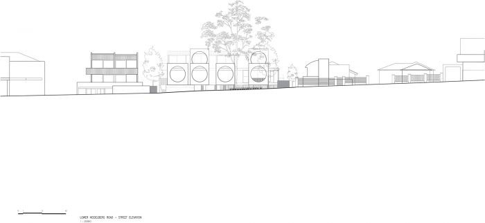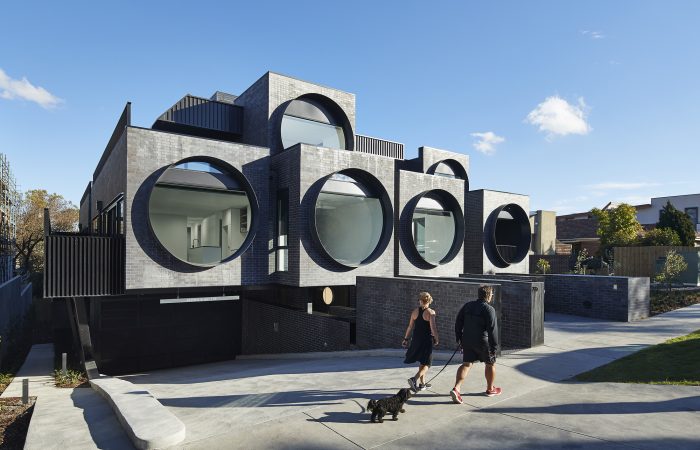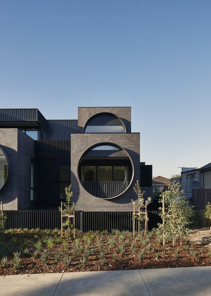 Large brick boxes project at various depths, replicating the rhythm of a suburban streetscape and leaving a substantial ‘front yard’. Six large oculi puncture the facade, introducing formal inventiveness and reducing the overall building mass to let it sit more comfortably within its single and double storey context. This is also assisted by the steeply sloping site, allowing the bulk of the building to sit below the line of sight when viewed from the road.