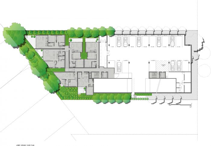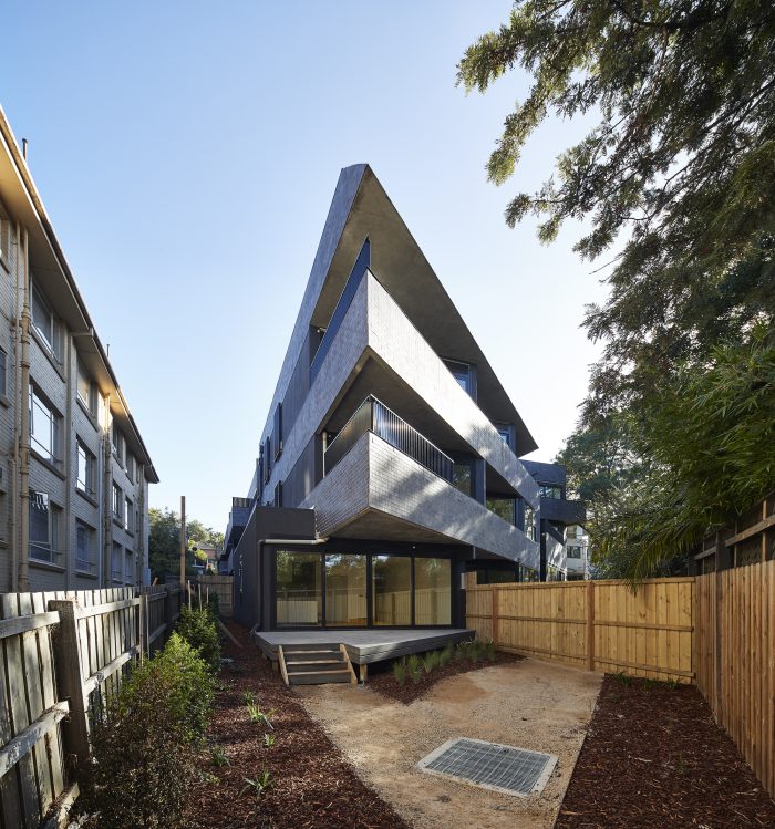 Situated on a steeply sloping block in the leafy suburb of Ivanhoe, the apartments echo local character through their materiality and volumetric composition. Weathered brick, standing seam metal and wooden partitions reflect the material language of the surrounding art deco and federation era homes.