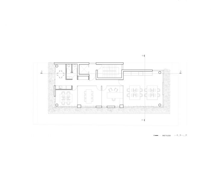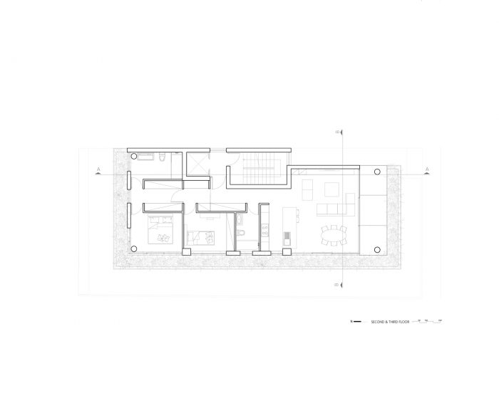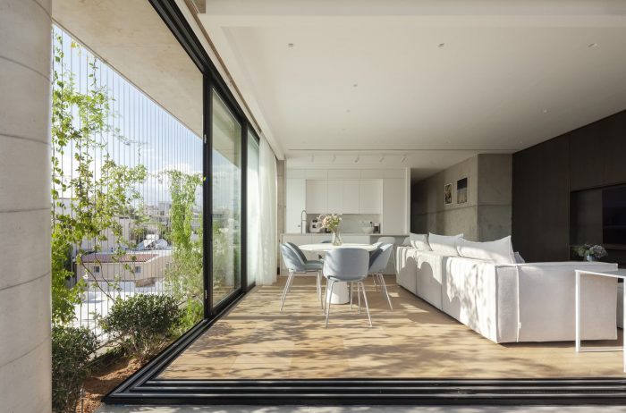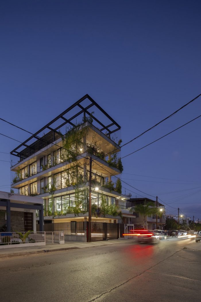 The building is located in the densely populated area of Ayios Nikolaos, east of the center of Limassol. An area characterized by the single-family houses of the 60s and 70s and that has been undergoing intense urban and architectural changes in the last decade. The building is divided into five levels, the piloti, three stories, and the roof garden. The piloti allows access to the building and is also the parking area. The first floor houses an architecture studio space with a drawing room and a meeting room. The second and third floors are floor apartments that include an open-plan kitchen, living room, dining room, two bedrooms, and two bathrooms. The open-plan apartments are surrounded by south and west-facing openings while the bedrooms are west and north facing.