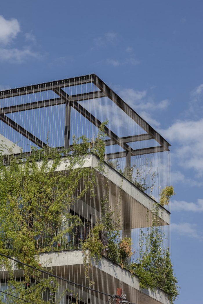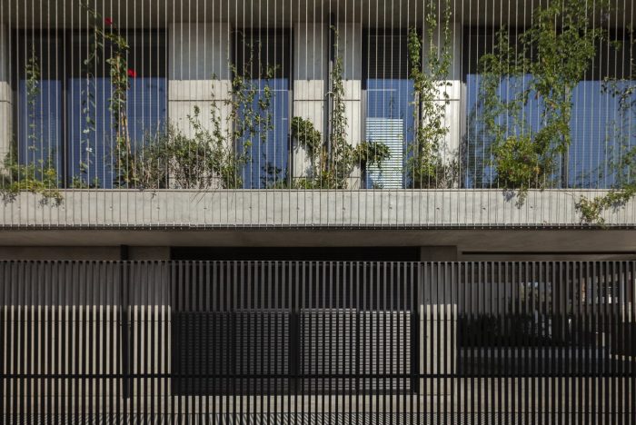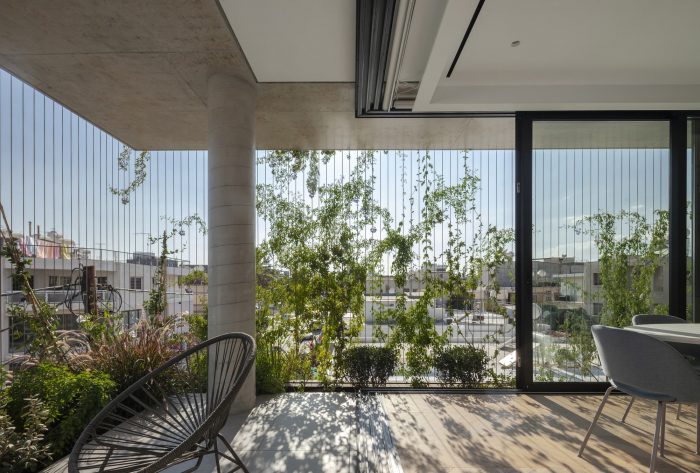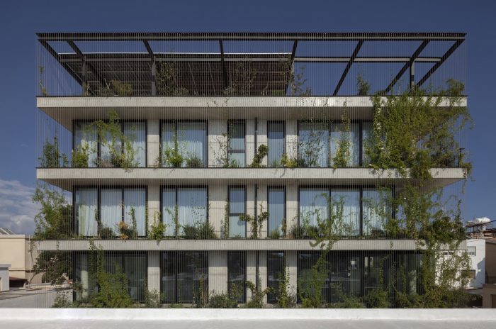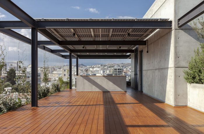 All interiors are surrounded by sliding thermal aluminum glazing. On the one hand, they help reduce energy loss while on the other hand, they unify the exterior and interior spaces, allowing the user to have an unobstructed view of the green facade. The roof garden consists of a dining area, lounge area, and barbecue facilities. A metal pergola covers the entire rooftop. Double-sided photovoltaic panels are located on the upper part of the pergola, helping to reduce the energy consumption of the building and creating shade during the daytime. The project as a living urban cell evolves as an active member of the neighborhood. Urban garden, my neighbor. Sustainability, Experimentation, Change.