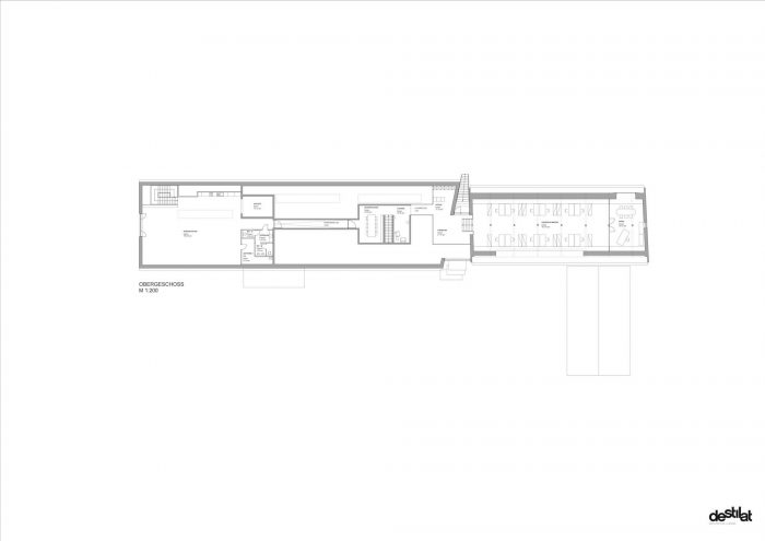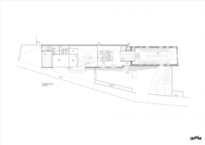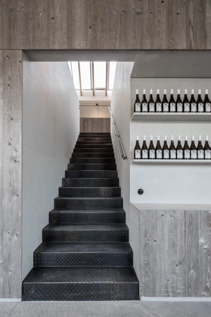 The interior design distinguishes itself with building-block-like cubes, light as a central design element, grey in all its nuances, and aesthetics that highlight the work processes involved in wine-making. A vaulted cellar, tasting room, kitchen, and office form massive spatial components that are interwoven into the structural shell, define spatial borders, and take over several functions.