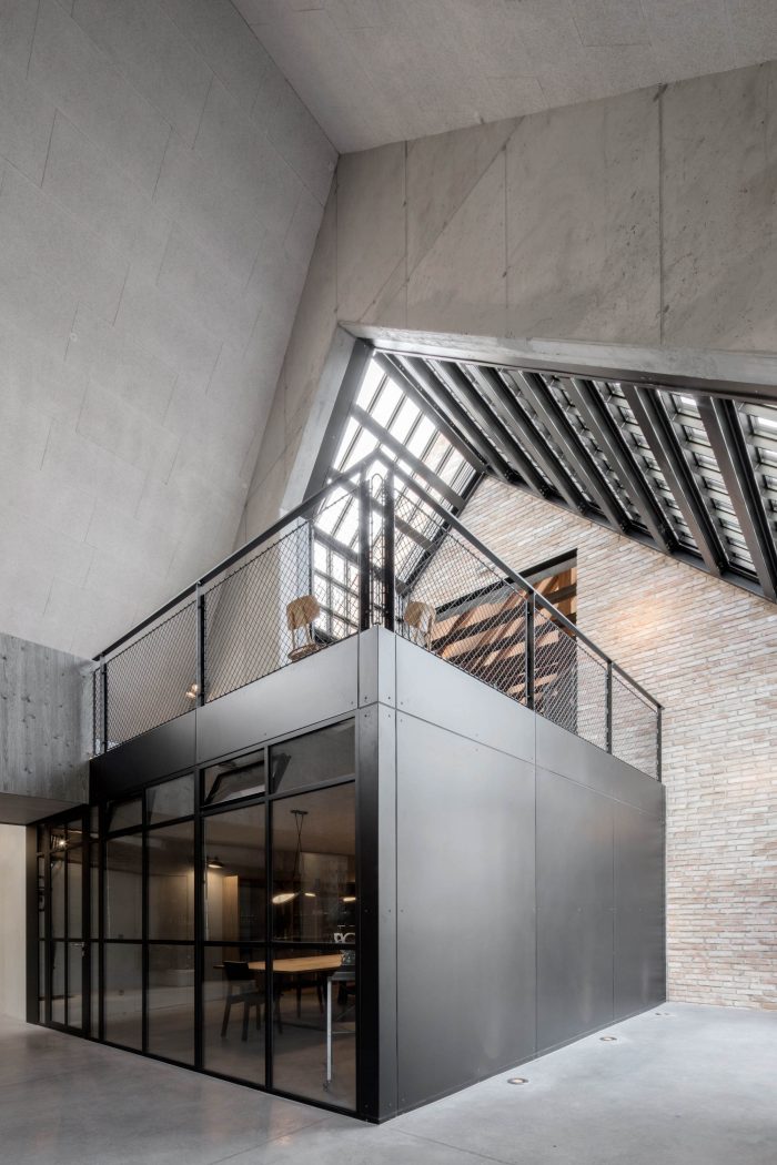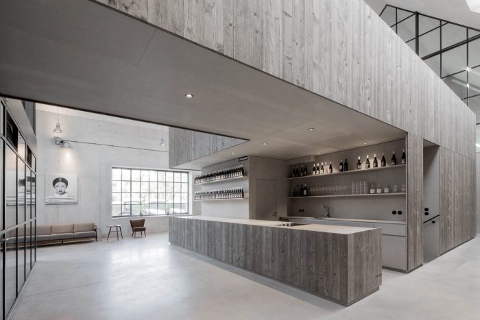 The vast open spaces between these components make them usable in many different ways and provide a big stage for light and all its effects. Exposed concrete walls, polished concrete floors, grey varnished spruce wood, anthracite-coloured Eternit, scaled steel, glass, and grey-washed brickwork – that is the combination of historic and modern materials characterizes the interior design, as its reduced colour palette brings out the fine nuances of the materials’ aesthetics.