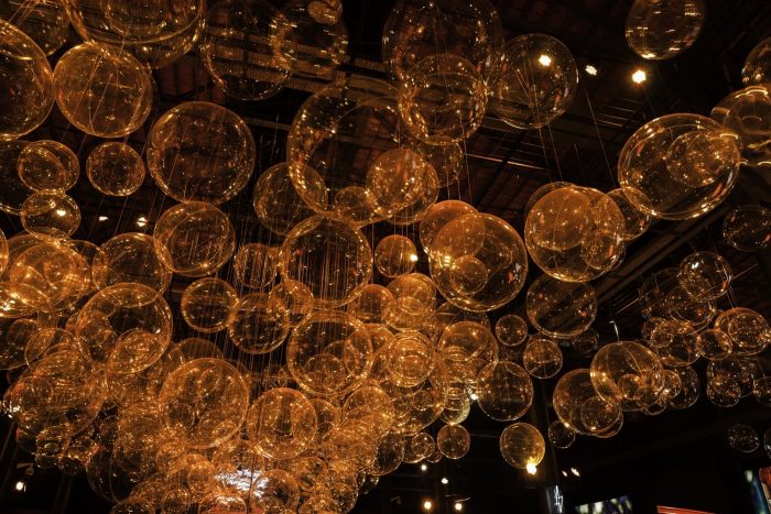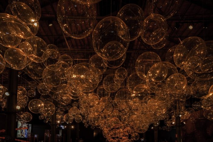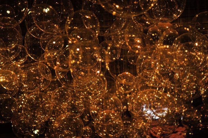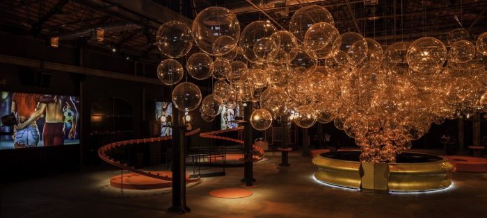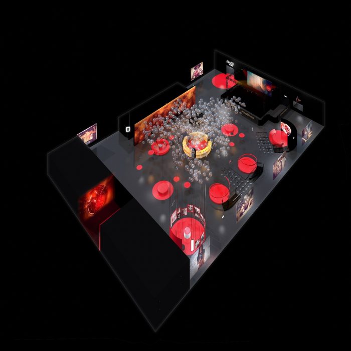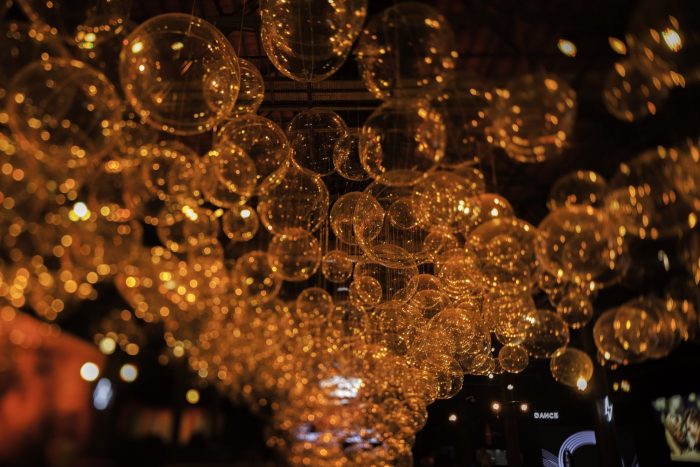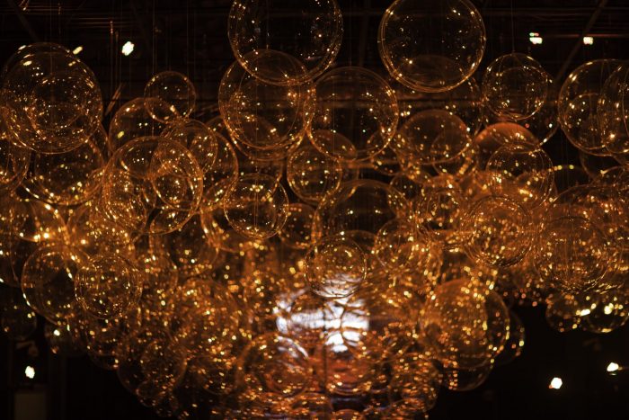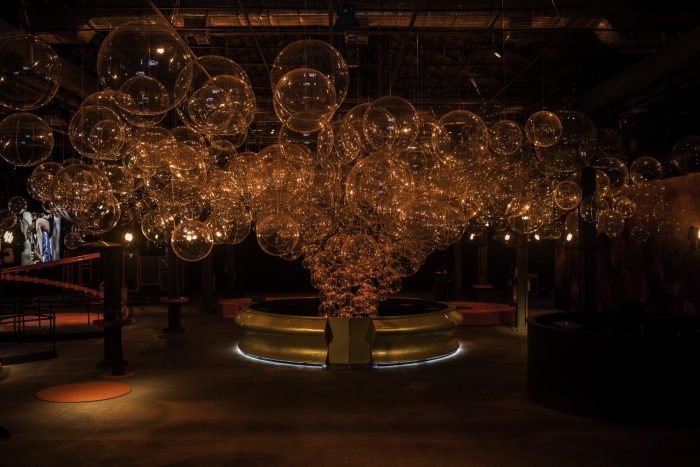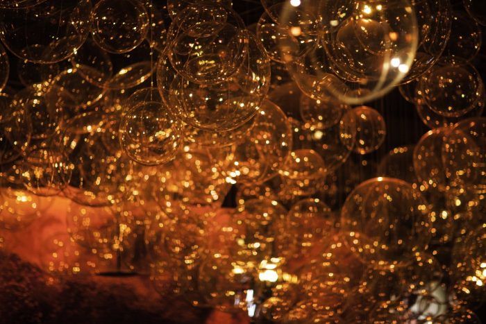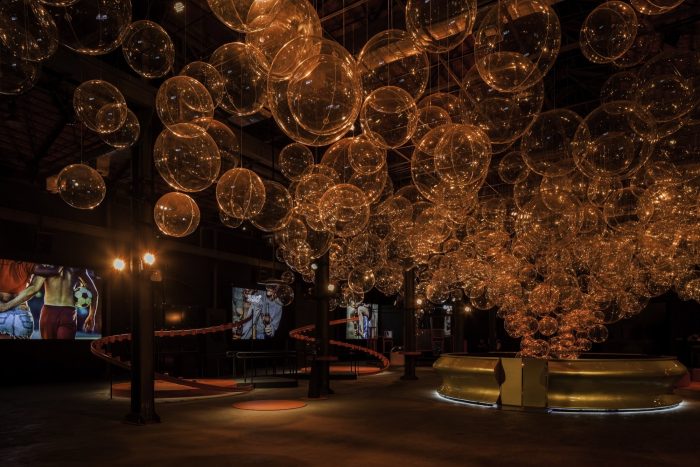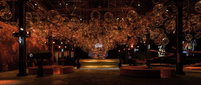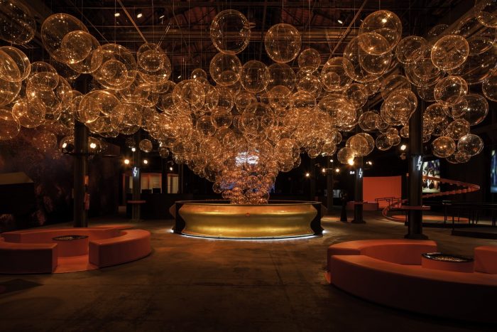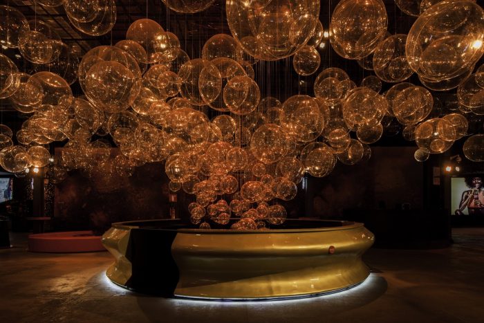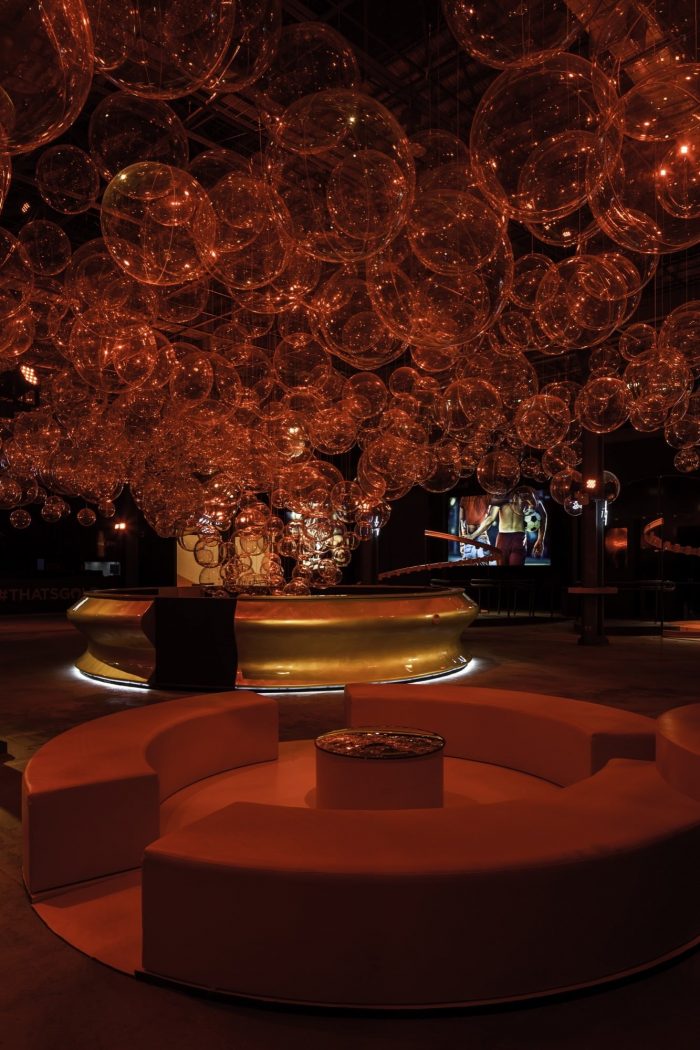 The public experience culminated In the center of the space made out of more than five hundred translucent acrylic spheres that simulated the physical behaviour of sparkling bubbles. A design process took advantage of generative parametric softwares that could simulate such a natural phenomenon. that A seven meter wide golden finished bar marks the center of the installation.