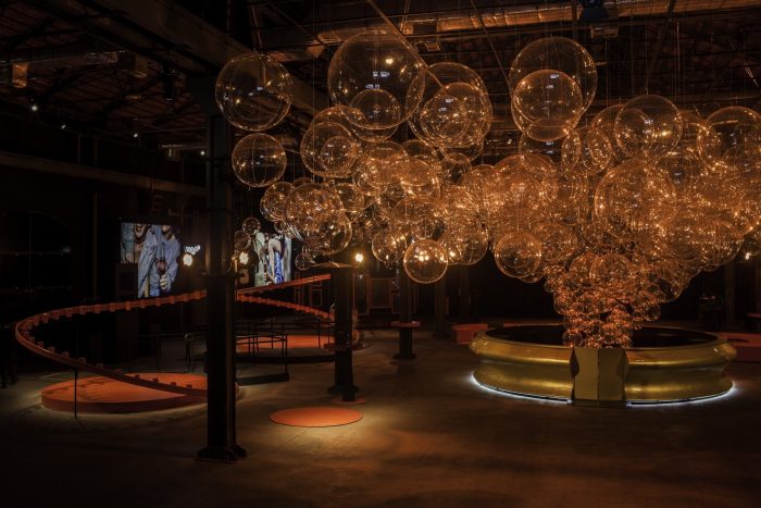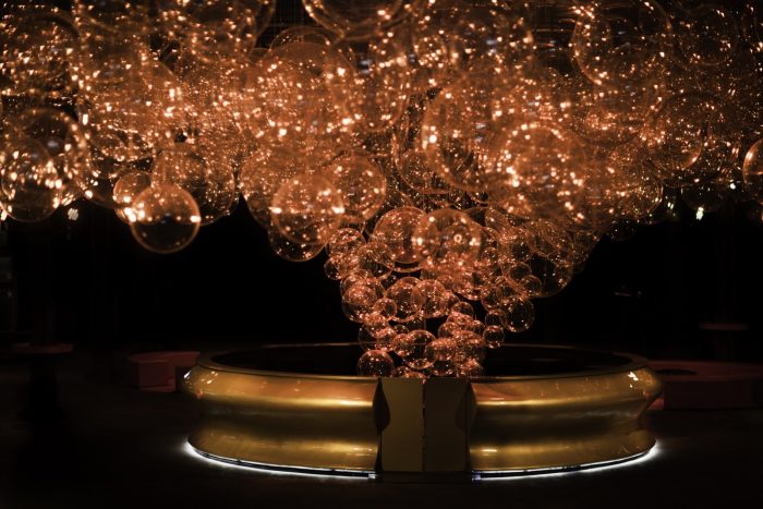 公众体验的高潮是在空间的中心,由500多个半透明的丙烯酸球体组成,模拟了闪亮的气泡的物理行为。一个设计过程利用了可以模拟这种自然现象的生成参数化软件。 一个七米宽的金色成品条标志着装置的中心。