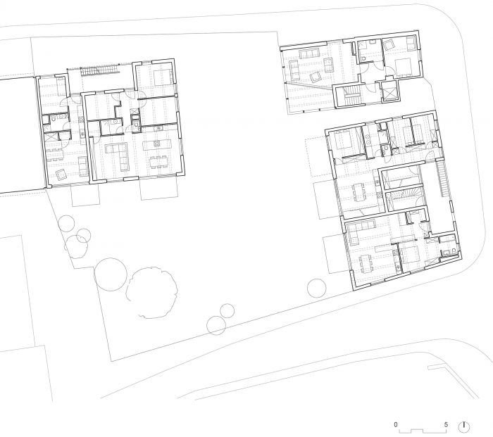 Three separate building volumes are connected by an L-shaped circulation axis, along which the entrances to the flats and the collective spaces are located. This maximizes the chances of meeting each other and strengthens collectivity.