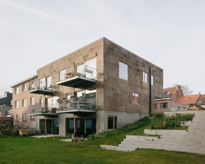 The housing buildings are constructed with a skeleton structure of wooden beams and columns, insulated with cellulose insulation, and clad with cork panels, and in Belgium unknown, but very versatile material. The cork panels, compressed leftovers from the cork industry, are water-resistant, breathable, thermally insulating, and rot-resistant. Because of their high density, they also buffer sound better than traditional facade insulation and protect the building from overheating. Being a natural product, the heterogonous color gives the building a warm and soft touch.