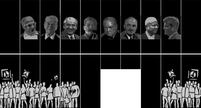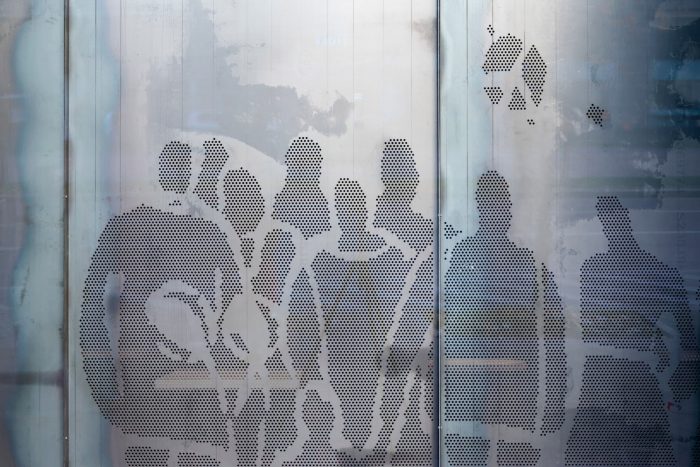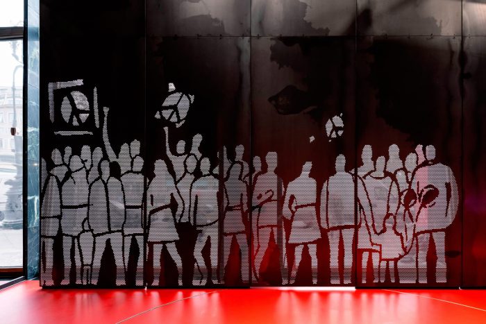 To enter the museum's foyer, visitors symbolically walk through an "Iron Curtain". The design was created by the Ukrainian artist Vanda Sakhatska. The installation takes up the entire street-side window front and consists of 20 steel elements. The upper part is perforated with the portraits of a selection of politicians who were active in the Cold War era, including Helmut Kohl, Ronald Reagan, Mikhail Gorbachev, Josef Stalin, Winston Churchill, Harry S. Truman, Nikita S. Khrushchev, John F. Kennedy. The lower half shows life-size silhouettes of people united under the peace sign of the "Campaign for Nuclear Disarmament". When daylight falls in, the figures and portraits are clearly visible in the foyer. During the day, they are only dimly discernible from the outside, but in the evening, when the museum is brightly lit, the perforated patterns also unfold their effect in the direction of Berlin's boulevard. In contrast to the cold, technical, industrial steel of the "Iron Curtain", the floor of the entrance area shines in bright red.