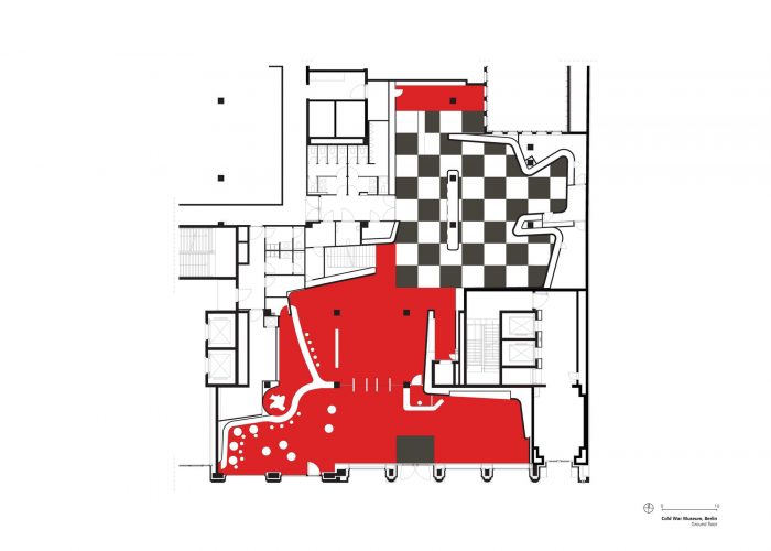 The exhibition area on the ground floor is entered through an entrance sluice. The floor in the first section of the exhibition is designed in a black and white chessboard pattern: as living chess pieces, visitors are thus immersed in the history of the Cold War.