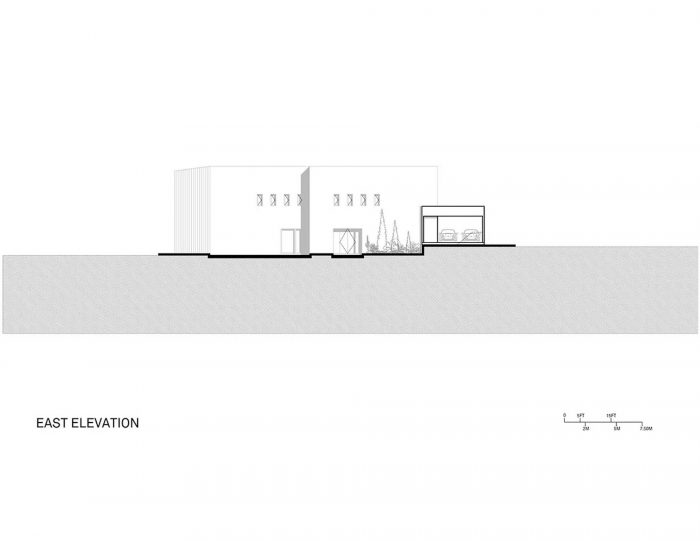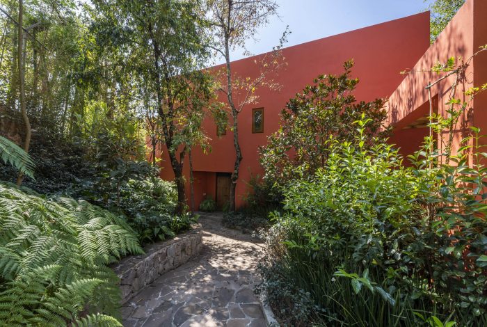 The house is accessed through the upper part of the lot and is entered by a narrow and winding vehicular road that reaches a mini gazebo and parking. From here, the rear facade of the house can be seen, with its very sober and minimalist volumes with only a few small windows in a red clay wall behind dense vegetation. It is an invitation to discover the house, which from this perspective only reveals little of itself.