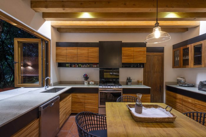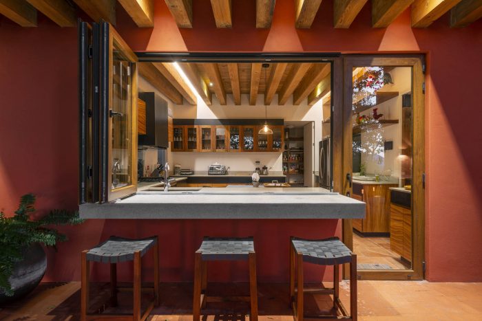 The kitchen has a bar that joins the terrace, completely shaded by several trees that cover it generating a green roof. This bar is used to pass food to the terrace or simply to keep the cook company. The terrace itself has a large bar with a grill and a sink for cooking outside.