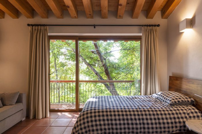 The stairs ascending from the hall reach the upper floor where there are four bedrooms. The main one has an unobstructed view of the entire landscape with a large bathroom with a tub and a shower and a window to the terrace. The rest of the bedrooms have their own views and special touches, each of them being a different experience of sleeping and habiting.