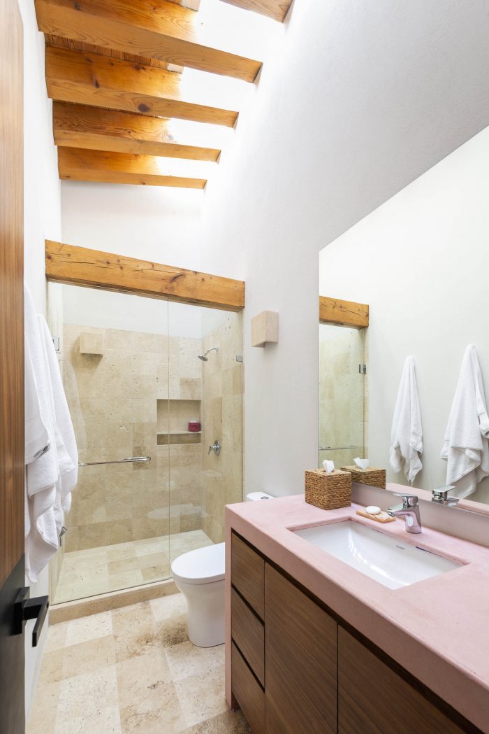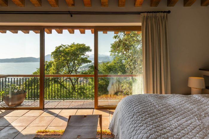 Upon entering Casa Colorada at the ground floor level, a receiving hall distributes the routes to the kitchen, toilet, living room and dining room, as well as to the stairs that connect to the upper floor. This hall has a window from which a glimpse of the lake and the mountains in the distance can be seen as an aperitif. Passing this hall, the living room and dining room are reached. They share a large, open space that connects to an intimate backyard to the east, as well as to a large open terrace with a pool and Jacuzzi to the west with views of the lake, the town and the mountains. At the end of this terrace, there is a wedge-shaped roofed area with a chimney that becomes the ideal place to enjoy the view and the natural environment, while at the same time being protected from the sun and the rain. The dining room opens onto the terrace and the interior patio, always ventilated and well lit. The interior patio is the place where the sun shines in the morning, perfect for going outside to drink a coffee and to warm up, or vice versa, take refuge from the setting sun during the afternoon. It is a monastic space without a view but surrounded by vegetation for tranquillity and peace while resting in a hammock. Finally, the living room and the dining room is connected with sliding windows to join the terrace, as well as the backyard.