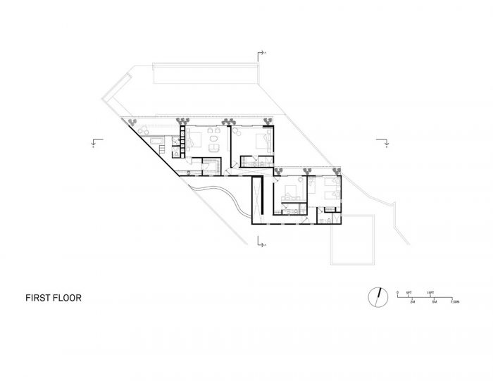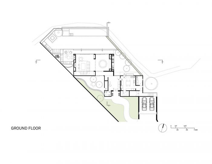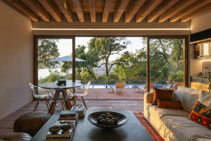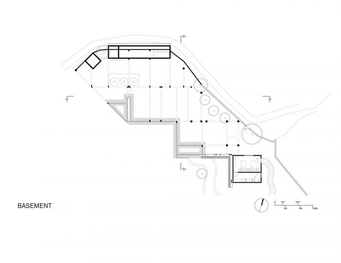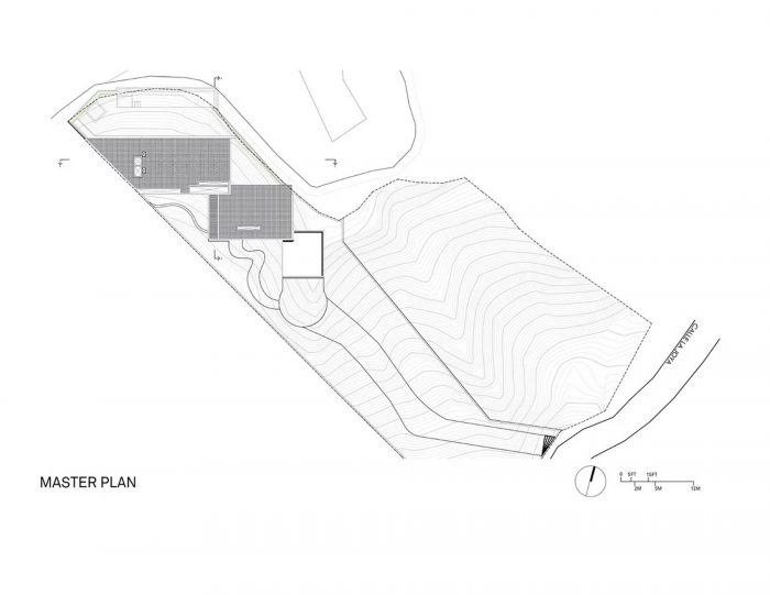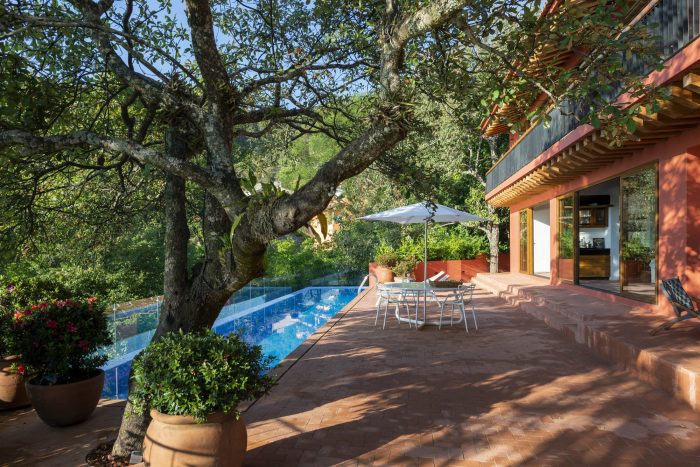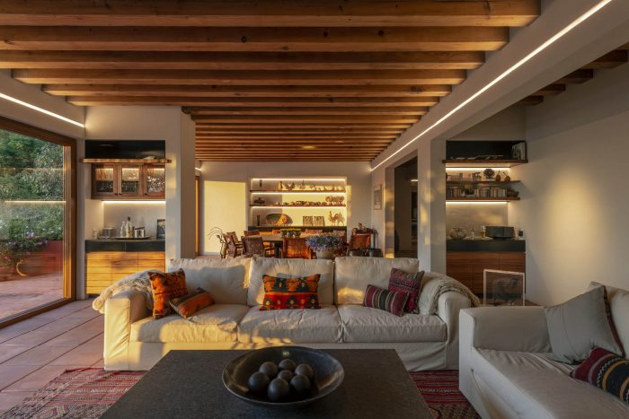 The lot presented special requirements as it was elongated, with steep slopes and many pine and oak trees. The architectural program was designed in a way to conserve the trees, only transplanting the small ones. The geometries of the house were played with so that it was built on columns that allow the trees to grow freely below. On the wide front terrace, multiple steps were designed for tree trunks and branches, which not only preserved the trees but also gives shade and greenery to the house.