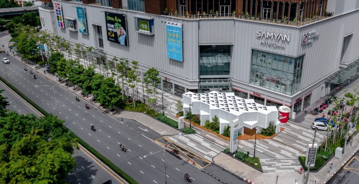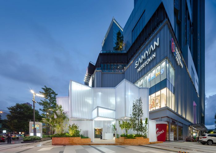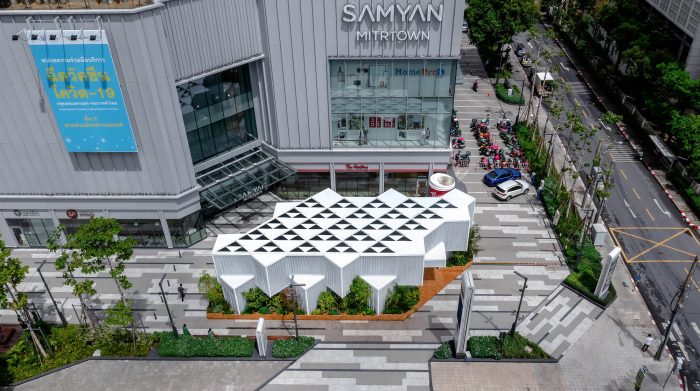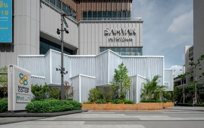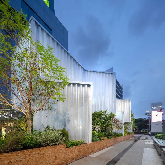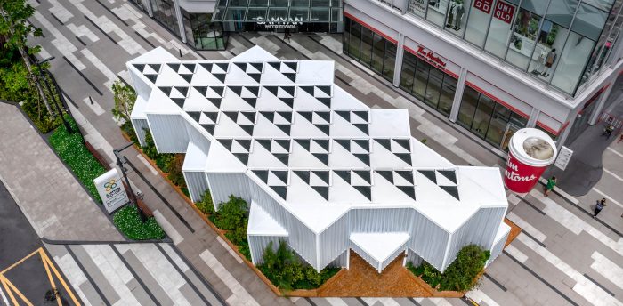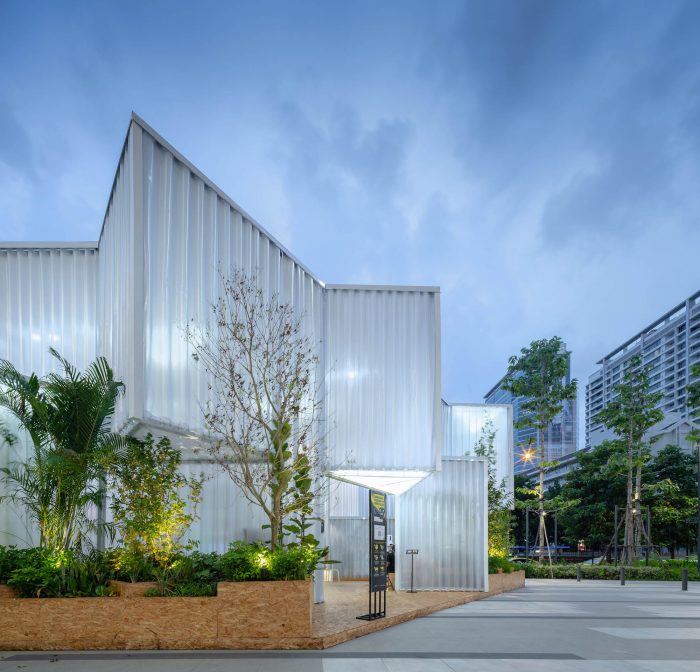 The Common Air-rea served as an information center, a meeting point, and a resting area for the attendees of the Bangkok Design Week 2021. Additionally, this space was used as an experiment for an air purification mechanism that was powered by a hybrid power system, i.e. using solar power in conjunction with electricity from traditional sources. This space was enclosed by translucent, light-filtering curtains. They not only prevented air pollution from entering the inside environment but also served as a filtration system for light and heat from the outside environment. However, the curtains still allowed for daylight to enhance the visibility inside the building and to provide a sense of public-ness to space.