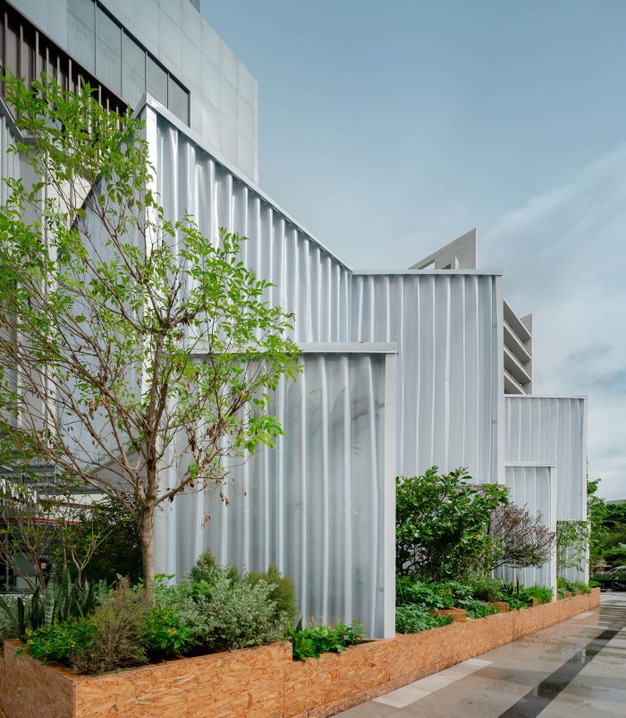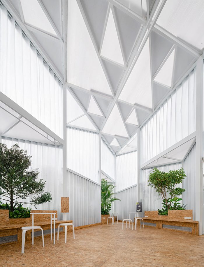Common Air-Rea作为信息中心、会议点和2021年曼谷设计周的与会者的休息区。此外,这个空间还被用作空气净化机制的实验,该机制由混合动力系统驱动,即使用太阳能与传统来源的电力相结合。这个空间被半透明的滤光窗帘所包围。它们不仅防止空气污染进入内部环境,而且还作为一个过滤系统,过滤来自外部环境的光和热。然而,窗帘仍然允许日光进入,以提高建筑内部的能见度,并为空间提供一种公共性的感觉。